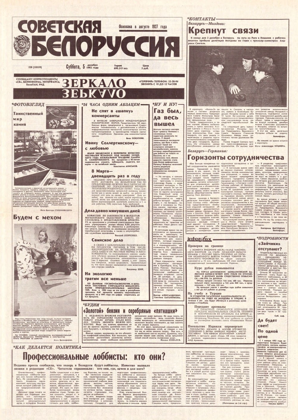 «Советская Белоруссия» — орган Центрального Комитета Коммунистической партии Белоруссии, Верховного Совета и Совета Министров БССР. Белорусская общественно-политическая газета. Издаётся с августа 1927 года. Выходит 5 раз в неделю. Учредители — Администрация президента Республики Беларусь и редакционный совет. На апрель 2019 года тираж — 190 тыс. экземпляров. Крупнейшее печатное СМИ страны. При этом во многих СМИ неоднократно сообщалось ... Болей »