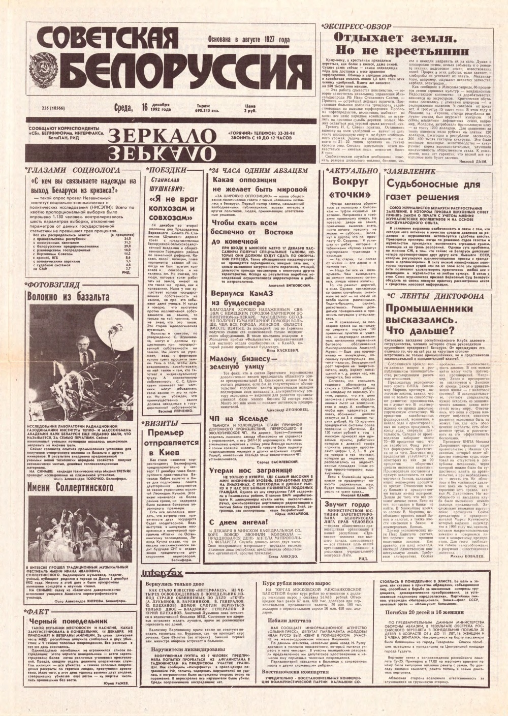 «Советская Белоруссия» — орган Центрального Комитета Коммунистической партии Белоруссии, Верховного Совета и Совета Министров БССР. Белорусская общественно-политическая газета. Издаётся с августа 1927 года. Выходит 5 раз в неделю. Учредители — Администрация президента Республики Беларусь и редакционный совет. На апрель 2019 года тираж — 190 тыс. экземпляров. Крупнейшее печатное СМИ страны. При этом во многих СМИ неоднократно сообщалось ... Болей »