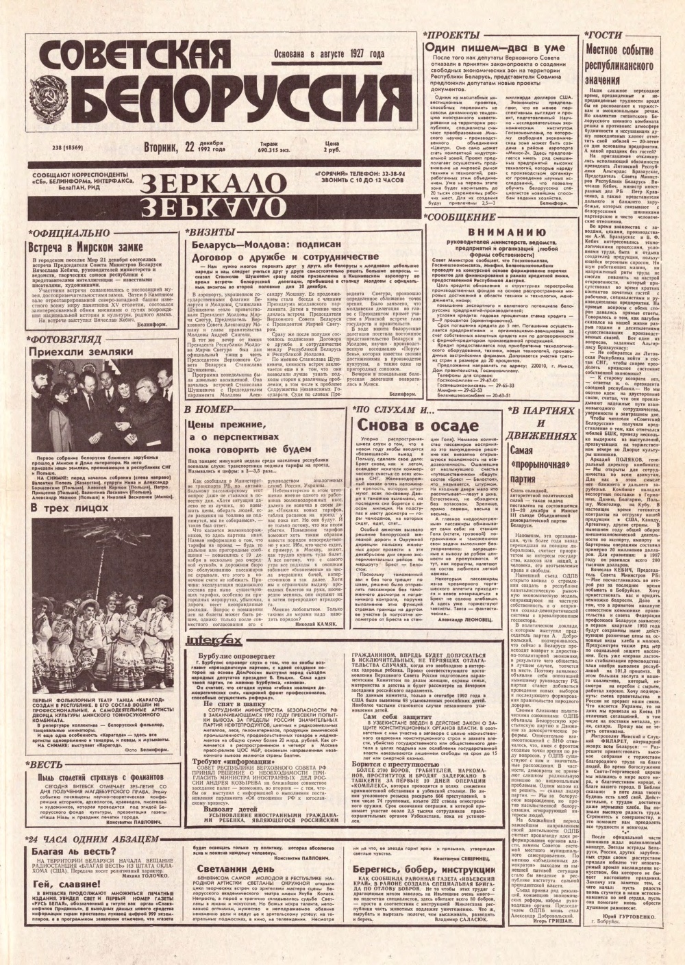 «Советская Белоруссия» — орган Центрального Комитета Коммунистической партии Белоруссии, Верховного Совета и Совета Министров БССР. Белорусская общественно-политическая газета. Издаётся с августа 1927 года. Выходит 5 раз в неделю. Учредители — Администрация президента Республики Беларусь и редакционный совет. На апрель 2019 года тираж — 190 тыс. экземпляров. Крупнейшее печатное СМИ страны. При этом во многих СМИ неоднократно сообщалось ... Болей »