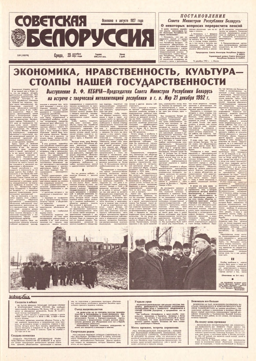 «Советская Белоруссия» — орган Центрального Комитета Коммунистической партии Белоруссии, Верховного Совета и Совета Министров БССР. Белорусская общественно-политическая газета. Издаётся с августа 1927 года. Выходит 5 раз в неделю. Учредители — Администрация президента Республики Беларусь и редакционный совет. На апрель 2019 года тираж — 190 тыс. экземпляров. Крупнейшее печатное СМИ страны. При этом во многих СМИ неоднократно сообщалось ... Болей »