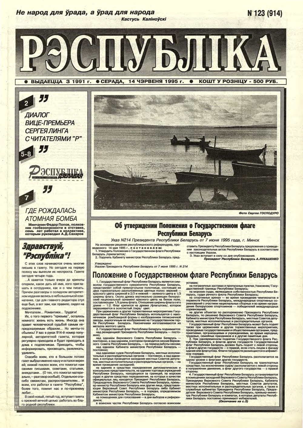 «Рэспубліка» — газета для тых, хто самастойна прымае рашэнні. Заснавальнік - Савет Міністраў Рэспублікі Беларусь. Выдаецца з чэрвеня 1991. Газета выходзіць 250 разоў у год. Аўтары апублікаваных матэрыялаў нясуць адказнасць за падбор і дакладнасць фактаў, іх меркаванні неабавязкова адлюстроўваюць пункт гледжання рэдакцыі. Рукапісы, фотаздымкі і малюнкі не рэцэнзуюцца і не вяртаюцца. Болей »
