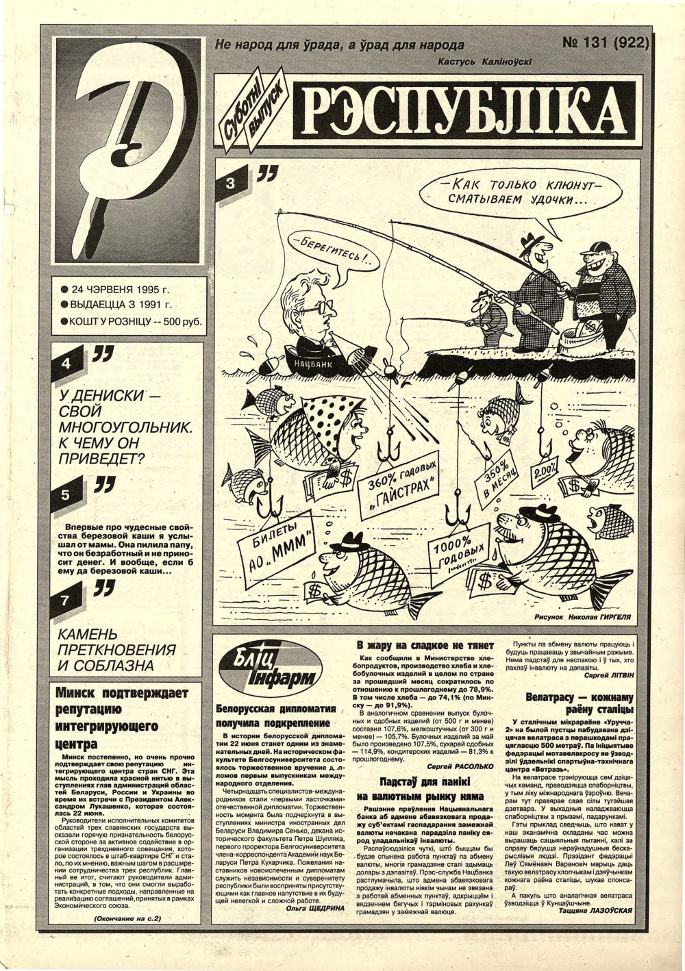 «Рэспубліка» — газета для тых, хто самастойна прымае рашэнні. Заснавальнік - Савет Міністраў Рэспублікі Беларусь. Выдаецца з чэрвеня 1991. Газета выходзіць 250 разоў у год. Аўтары апублікаваных матэрыялаў нясуць адказнасць за падбор і дакладнасць фактаў, іх меркаванні неабавязкова адлюстроўваюць пункт гледжання рэдакцыі. Рукапісы, фотаздымкі і малюнкі не рэцэнзуюцца і не вяртаюцца. Болей »