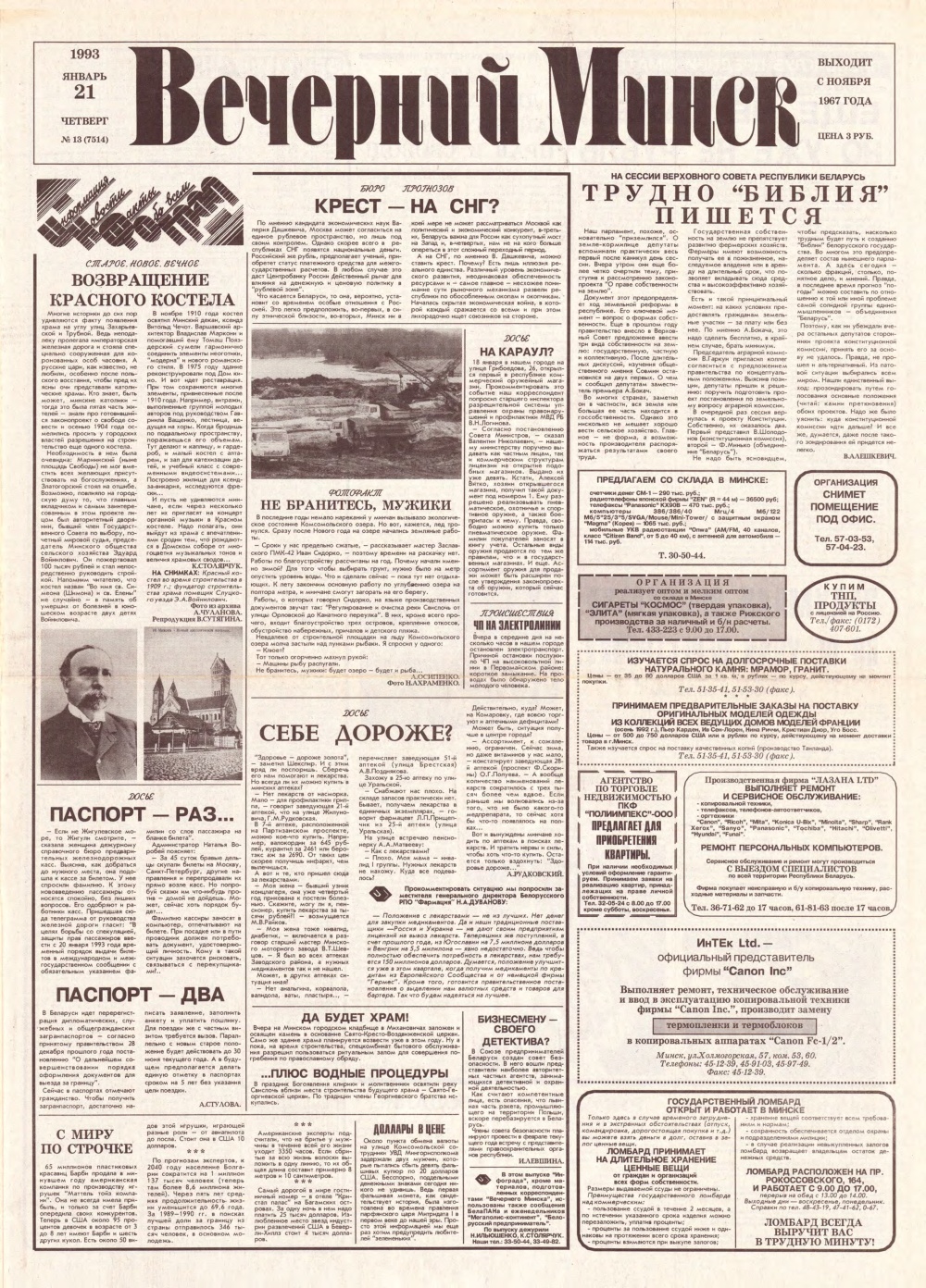 «Вечерний Минск» — выходит з ноября 1967 года. Учредитель: трудовой коллектив редакции газеты «Вечерний Минск». Газета издается на русском и белорусском языках, выходит 5 раз в неделю, кроме субботы и воскресенья — 250 раз в году. Болей »