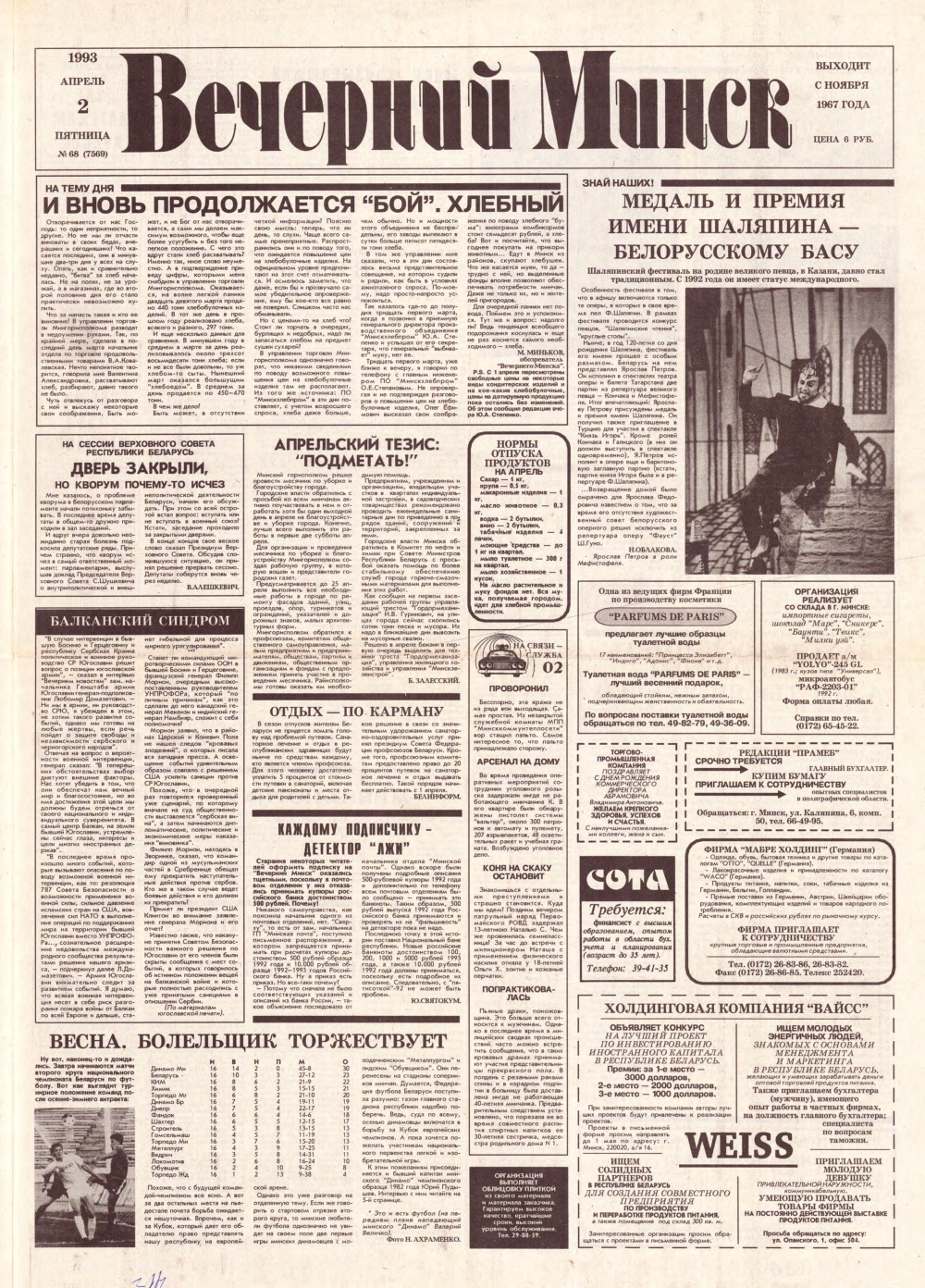 «Вечерний Минск» — выходит з ноября 1967 года. Учредитель: трудовой коллектив редакции газеты «Вечерний Минск». Газета издается на русском и белорусском языках, выходит 5 раз в неделю, кроме субботы и воскресенья — 250 раз в году. Болей »