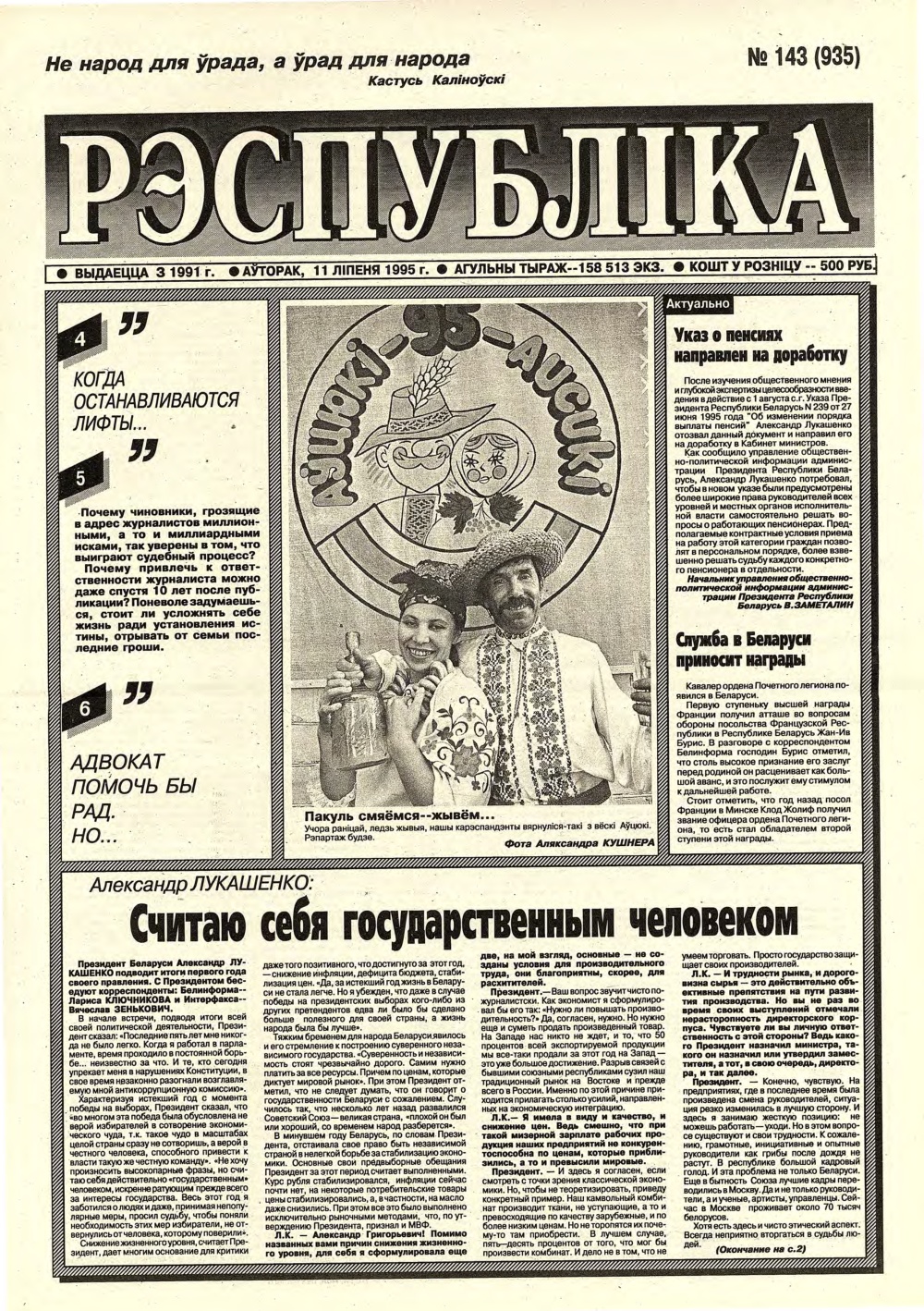 «Рэспубліка» — газета для тых, хто самастойна прымае рашэнні. Заснавальнік - Савет Міністраў Рэспублікі Беларусь. Выдаецца з чэрвеня 1991. Газета выходзіць 250 разоў у год. Аўтары апублікаваных матэрыялаў нясуць адказнасць за падбор і дакладнасць фактаў, іх меркаванні неабавязкова адлюстроўваюць пункт гледжання рэдакцыі. Рукапісы, фотаздымкі і малюнкі не рэцэнзуюцца і не вяртаюцца. Болей »