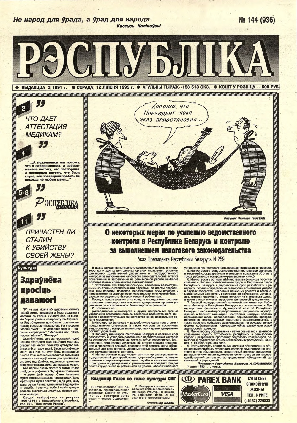 «Рэспубліка» — газета для тых, хто самастойна прымае рашэнні. Заснавальнік - Савет Міністраў Рэспублікі Беларусь. Выдаецца з чэрвеня 1991. Газета выходзіць 250 разоў у год. Аўтары апублікаваных матэрыялаў нясуць адказнасць за падбор і дакладнасць фактаў, іх меркаванні неабавязкова адлюстроўваюць пункт гледжання рэдакцыі. Рукапісы, фотаздымкі і малюнкі не рэцэнзуюцца і не вяртаюцца. Болей »
