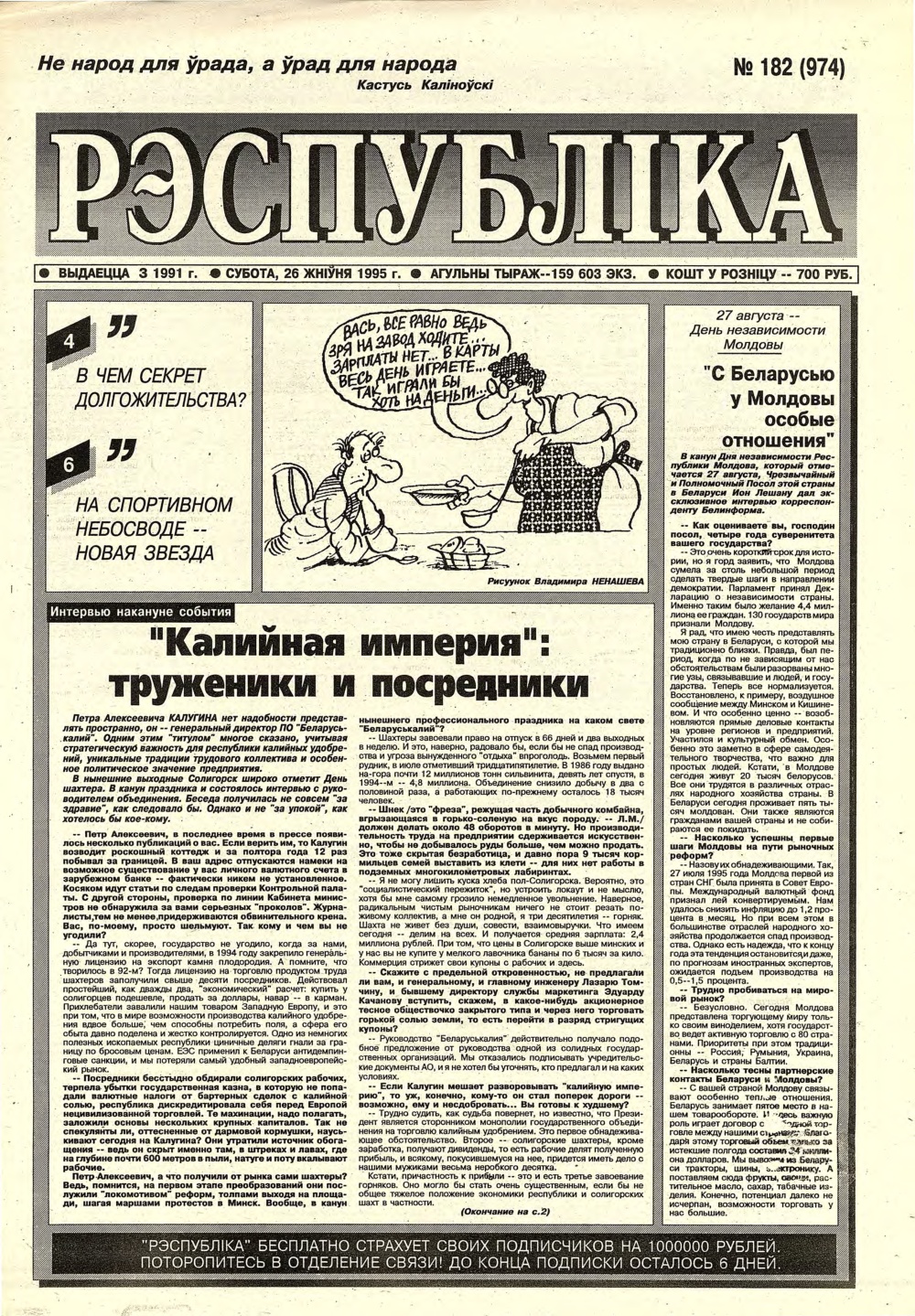 «Рэспубліка» — газета для тых, хто самастойна прымае рашэнні. Заснавальнік - Савет Міністраў Рэспублікі Беларусь. Выдаецца з чэрвеня 1991. Газета выходзіць 250 разоў у год. Аўтары апублікаваных матэрыялаў нясуць адказнасць за падбор і дакладнасць фактаў, іх меркаванні неабавязкова адлюстроўваюць пункт гледжання рэдакцыі. Рукапісы, фотаздымкі і малюнкі не рэцэнзуюцца і не вяртаюцца. Болей »