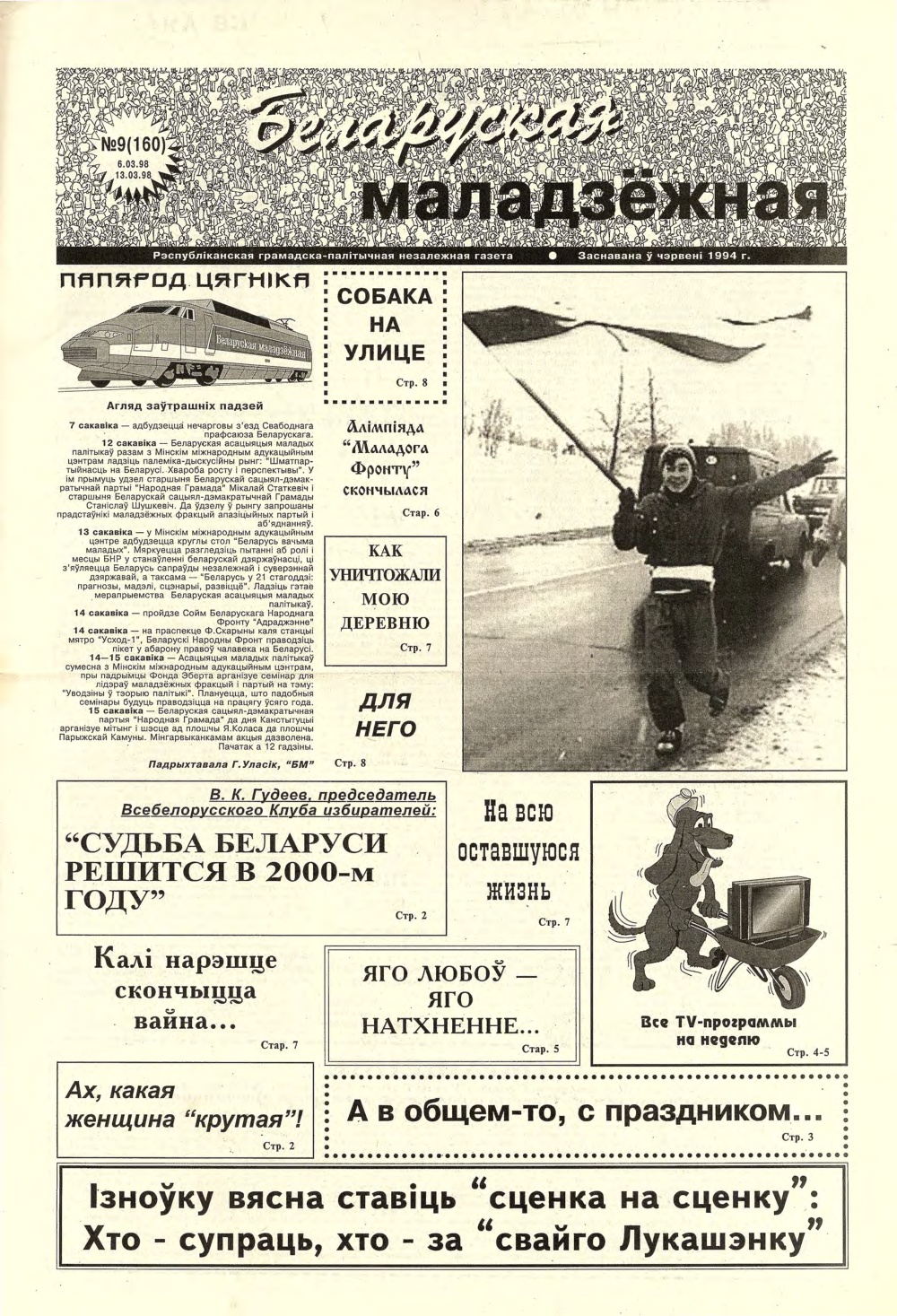 Беларуская маладзёжная (1994 - 2002) - беларуская газэта, дадатак да аднайменнай радыёстанцыі. Зарэгістраваная ў сакавіку 1994 году. У ёй друкаваліся расшыфроўкі радыйных гутарак, анонсы этэраў і ўсё, што не зьмяшчалася ў радыёфармат. Калі радыёстанцыю зачынілі, газэта засталася. Галоўны рэдактар — Тацьцяна Мельнічук. Традыцыйны фармат — 8 старонак А3. Газэта асьвятляла нараджэньне й разьвіцьцё палітычнай апазыцыі сярэдзіны-канца 1990-х... Болей »