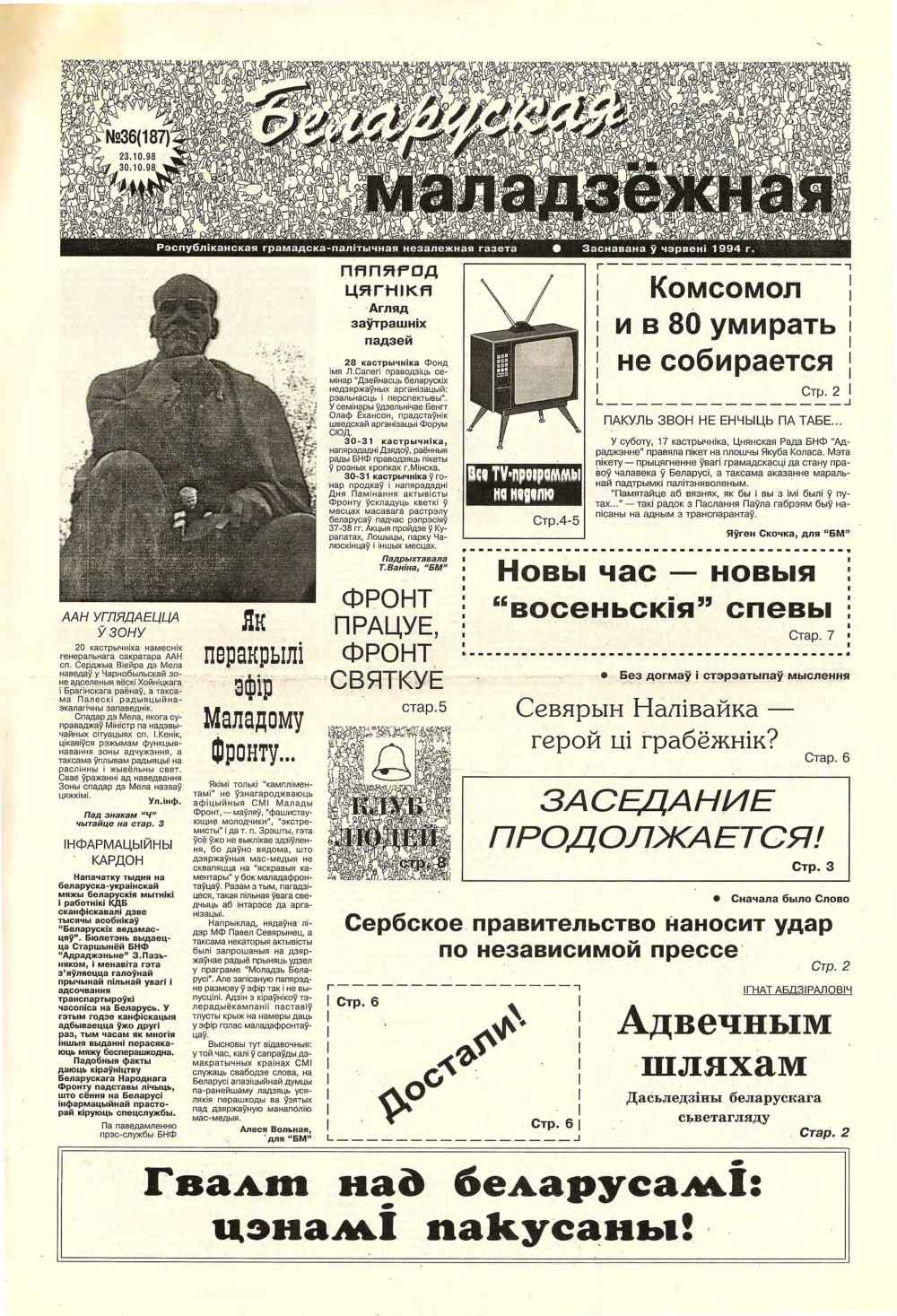 Беларуская маладзёжная (1994 - 2002) - беларуская газэта, дадатак да аднайменнай радыёстанцыі. Зарэгістраваная ў сакавіку 1994 году. У ёй друкаваліся расшыфроўкі радыйных гутарак, анонсы этэраў і ўсё, што не зьмяшчалася ў радыёфармат. Калі радыёстанцыю зачынілі, газэта засталася. Галоўны рэдактар — Тацьцяна Мельнічук. Традыцыйны фармат — 8 старонак А3. Газэта асьвятляла нараджэньне й разьвіцьцё палітычнай апазыцыі сярэдзіны-канца 1990-х... Болей »