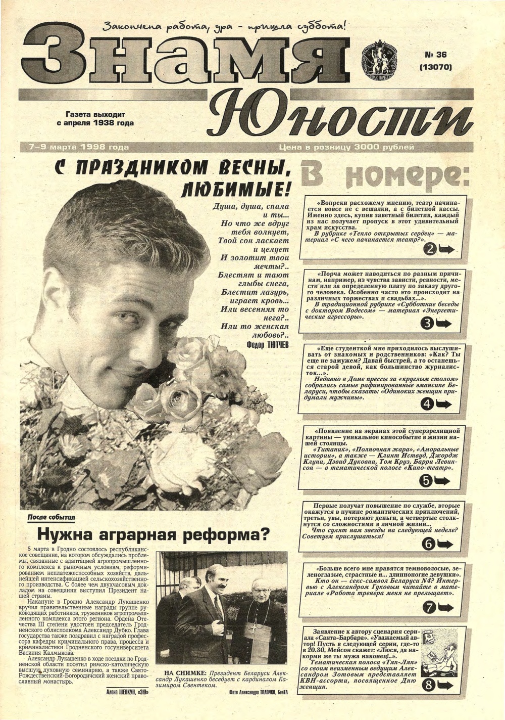 «Знамя юности» — общественно-политическая газета Белоруссии. Газета образована в 1938 году как совместный печатный орган Центрального комитета и Минского областного комитета ЛКСМ Белоруссии. Первый номер вышел 10 апреля 1938 года. Называлась газета «Сталинская молодёжь». Учредителем газеты с 1956 года являлся ЦК ЛКСМ Белоруссии. В годы Великой Отечественной войны газета выходила на одном из фронтов Красной Армии в виде листовки формата ... Болей »
