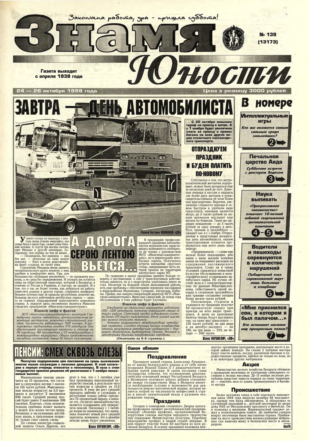 «Знамя юности» — общественно-политическая газета Белоруссии. Газета образована в 1938 году как совместный печатный орган Центрального комитета и Минского областного комитета ЛКСМ Белоруссии. Первый номер вышел 10 апреля 1938 года. Называлась газета «Сталинская молодёжь». Учредителем газеты с 1956 года являлся ЦК ЛКСМ Белоруссии. В годы Великой Отечественной войны газета выходила на одном из фронтов Красной Армии в виде листовки формата ... Болей »