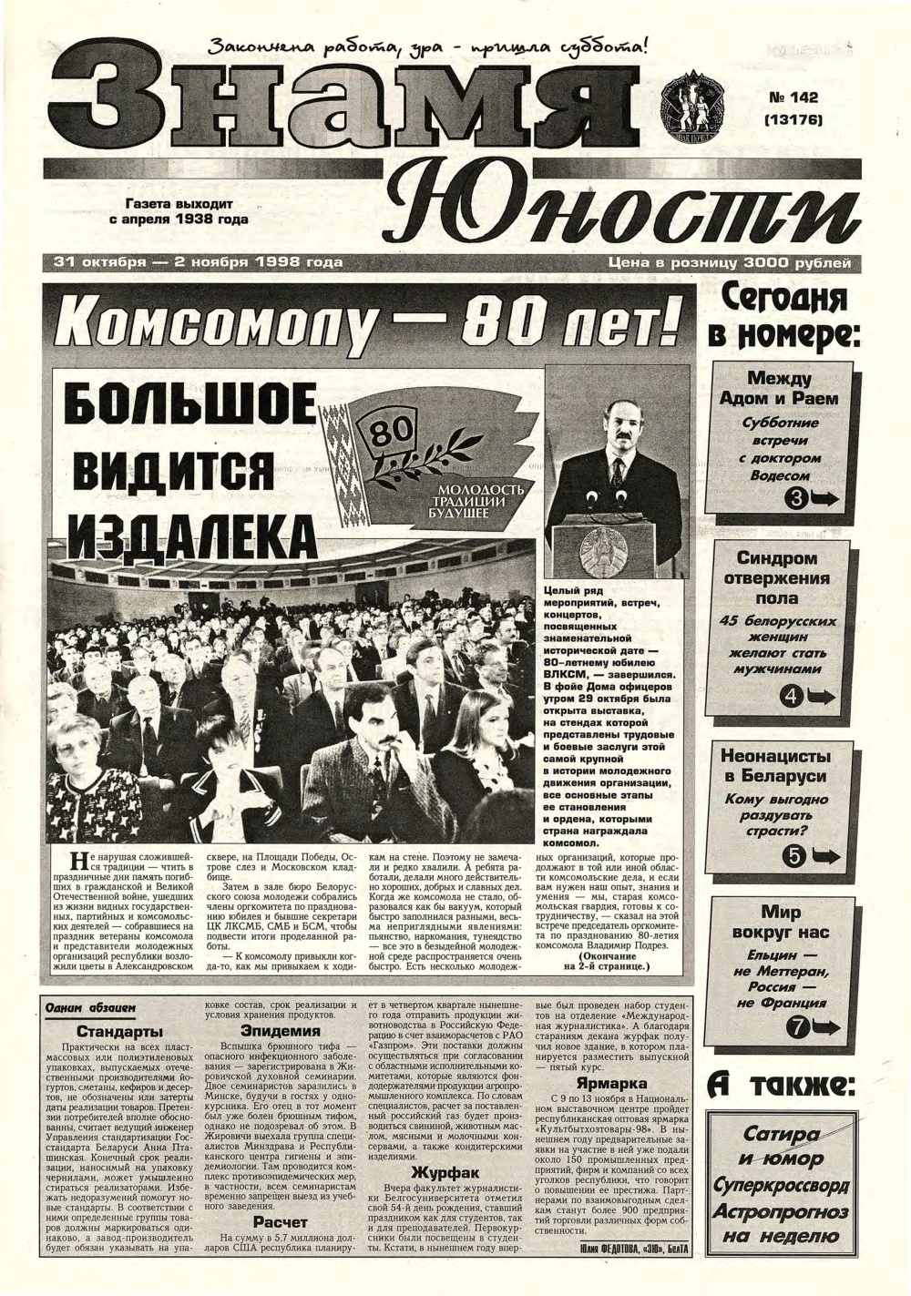 «Знамя юности» — общественно-политическая газета Белоруссии. Газета образована в 1938 году как совместный печатный орган Центрального комитета и Минского областного комитета ЛКСМ Белоруссии. Первый номер вышел 10 апреля 1938 года. Называлась газета «Сталинская молодёжь». Учредителем газеты с 1956 года являлся ЦК ЛКСМ Белоруссии. В годы Великой Отечественной войны газета выходила на одном из фронтов Красной Армии в виде листовки формата ... Болей »