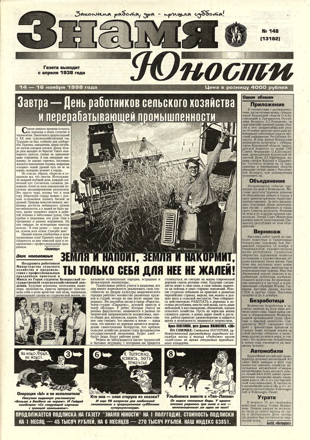 «Знамя юности» — общественно-политическая газета Белоруссии. Газета образована в 1938 году как совместный печатный орган Центрального комитета и Минского областного комитета ЛКСМ Белоруссии. Первый номер вышел 10 апреля 1938 года. Называлась газета «Сталинская молодёжь». Учредителем газеты с 1956 года являлся ЦК ЛКСМ Белоруссии. В годы Великой Отечественной войны газета выходила на одном из фронтов Красной Армии в виде листовки формата ... Болей »