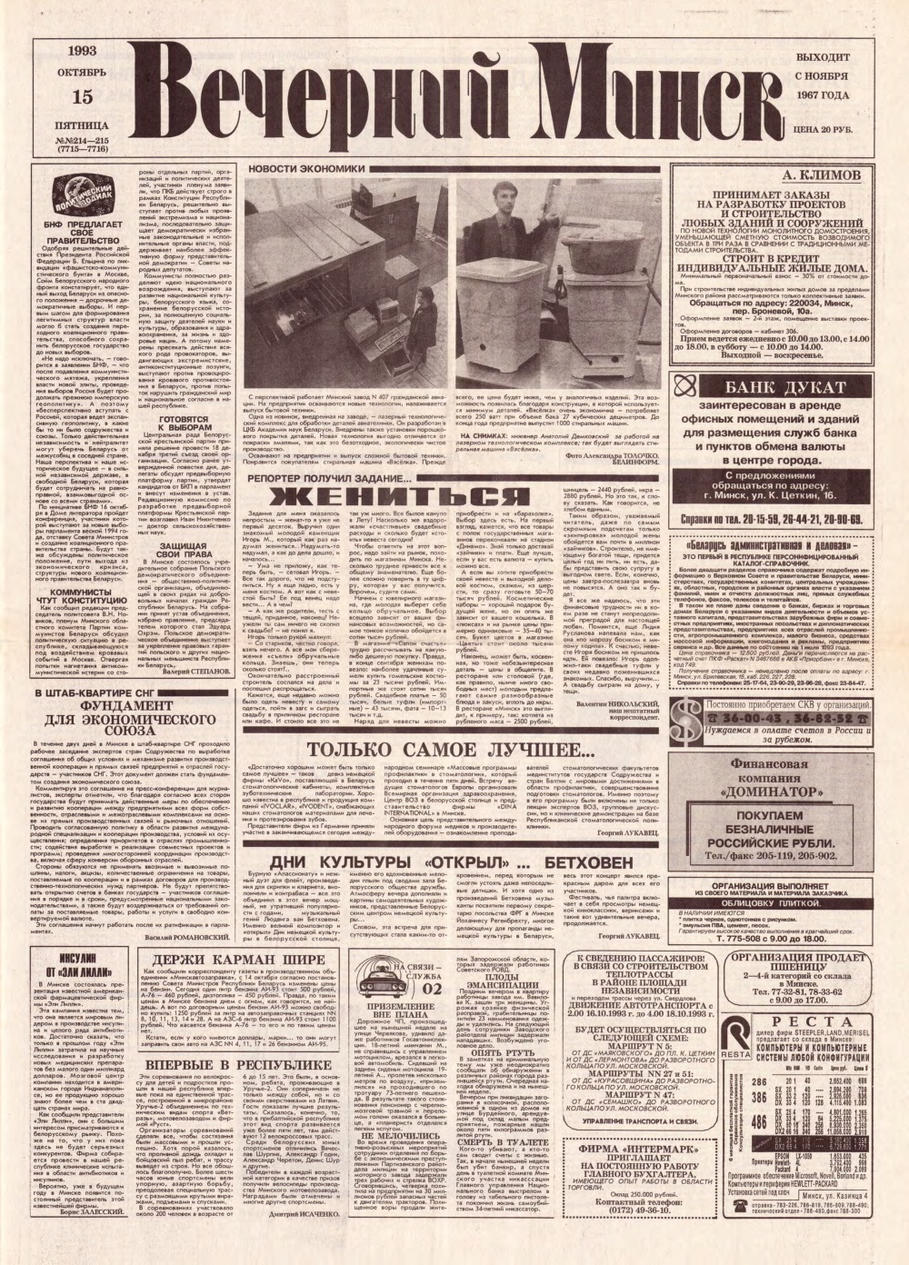 «Вечерний Минск» — выходит з ноября 1967 года. Учредитель: трудовой коллектив редакции газеты «Вечерний Минск». Газета издается на русском и белорусском языках, выходит 5 раз в неделю, кроме субботы и воскресенья — 250 раз в году. Болей »