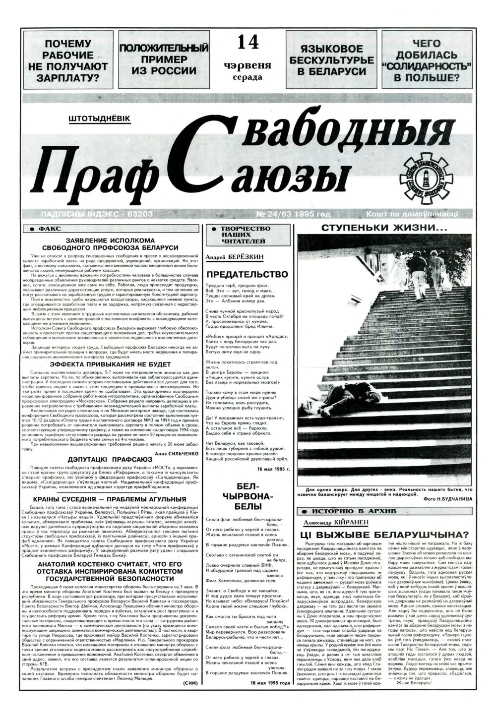 «Свабодныя прафсаюзы» — выдаецца з лістапада 1993 года на беларускай і рускай мовах. Заснавзльнікі: Беларускі кангрэс дэмакратычных прафсаюзаў. Рукапісы не рэцэнзуюцца і не вяртаюцца. Рэдакцыя можа друкаваць артыкулы ў парадку абмеркавання, не падзяляючы пункту гледжання аўтара. Болей »