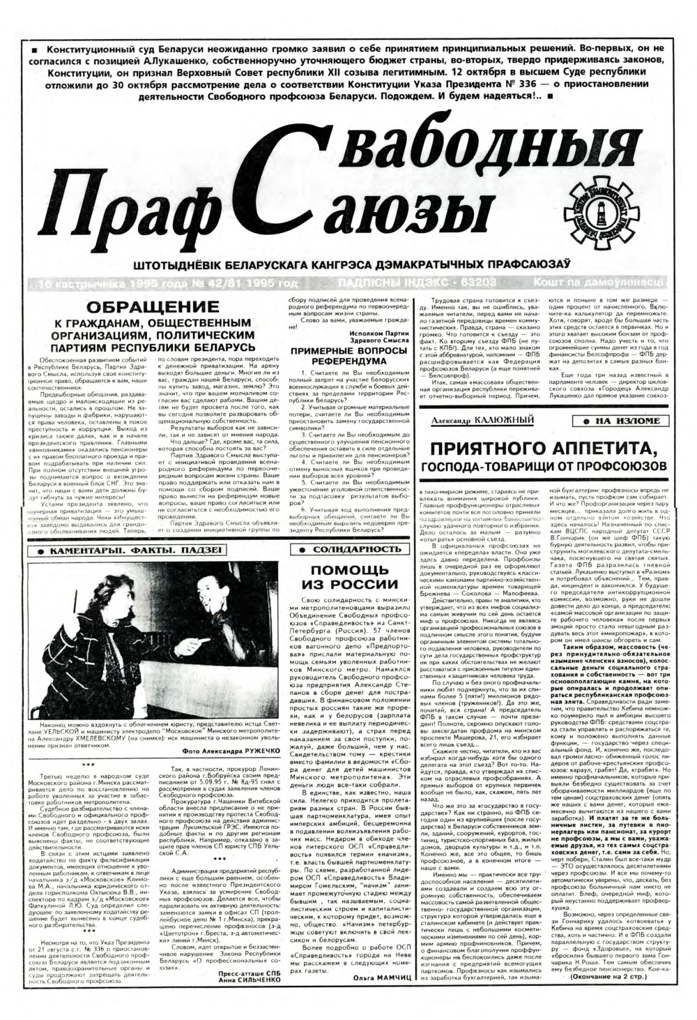 «Свабодныя прафсаюзы» — выдаецца з лістапада 1993 года на беларускай і рускай мовах. Заснавзльнікі: Беларускі кангрэс дэмакратычных прафсаюзаў. Рукапісы не рэцэнзуюцца і не вяртаюцца. Рэдакцыя можа друкаваць артыкулы ў парадку абмеркавання, не падзяляючы пункту гледжання аўтара. Болей »
