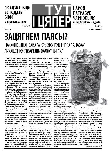 Зацягнеі паясы? На фоне фінансавага крызісу Пуцін прапанаваў Лукашэнку стварыць валютны пул. Нягледзячы на чарговую порцыю дывідэндаў з боку Расіі, „непадуладнасць” Беларусі сусветным фінансавым крызісам і самыя вялікія золатавалютныя запасы за ўвесь час нашай незалежнасці, беларусам у хуткім часе, відаць, давядзецца зацягнуць паясы. Папярэднія вынікі нядаўняга візіту расійскага прэм’ер-міністра Уладзіміра Пуціна ў Беларусь засведчылі, прынамсі, дзве рэчы. Першая – РБ атрымае ад Расіі льготны крэдыт памерам у 2 мільярды даляраў. Другая – гэтым крэдытам мы і будзем разлічвацца з Расіяй за пастаўкі газу ў 2009 годзе. Тое, што нам ніхто не прадасць газ па 140 даляраў за тысячу кубоў (на гэтай лічбе грунтуецца ўвесь нацыянальны бюджэт на наступны год), ускосна пацвердзіў міністр фінансаў РБ Андрэй Харкавец, які днямі заявіў наступнае: „Падвышэнне кошту на газ не з’яўляецца для беларускай эканомікі вялікай праблемай, і бюджэт здолее адаптавацца да новага ўзроўню коштаў”... (фрагмэнт)