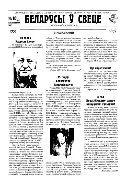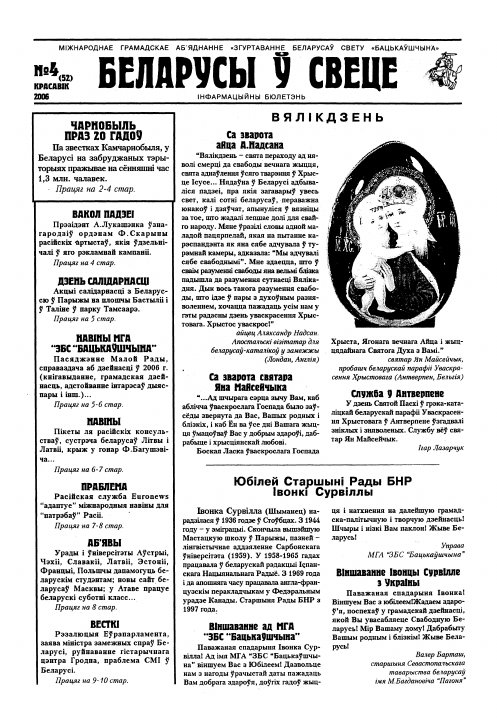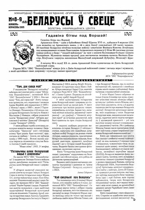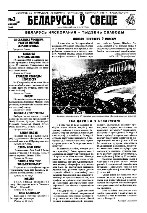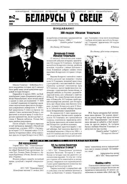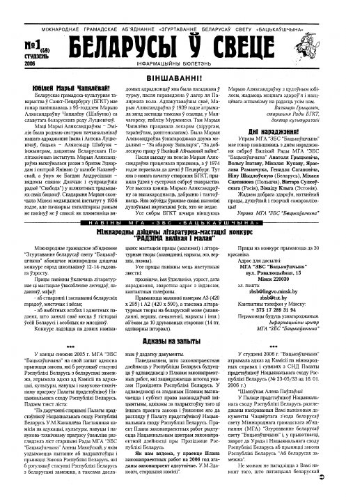 Згуртаванне беларусаў свету «Бацькаўшчына», ЗБС «Бацькаўшчына» — міжнароднае грамадскае аб'яднанне. Створана дзеля захавання беларускай прысутнасці ў свеце, яднання ў адзіную супольнасць усіх беларусаў, павышэння аўтарытэту беларускай нацыі на міжнародным узроўні. Першым Прэзідэнтам ЗБС «Бацькаўшчына» ў 1990 быў абраны Васіль Быкаў, Старшынёй Рады — Яўген Лецка. Першы з'езд беларусаў свету адбыўся 8-10 ліпеня 1993 г. ў Мінску. Прэзідэнт... Болей »
