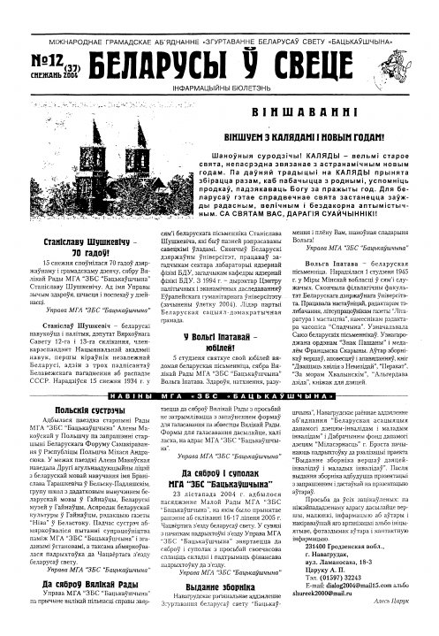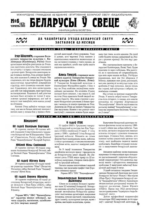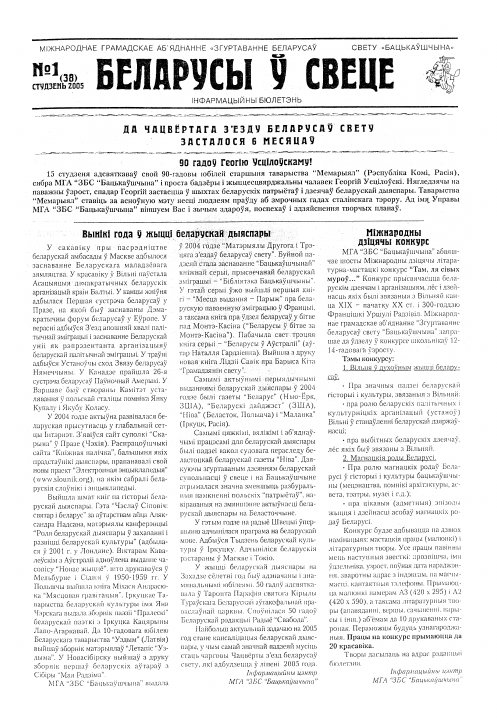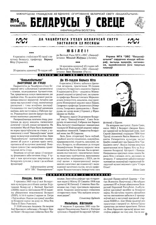 Згуртаванне беларусаў свету «Бацькаўшчына», ЗБС «Бацькаўшчына» — міжнароднае грамадскае аб'яднанне. Створана дзеля захавання беларускай прысутнасці ў свеце, яднання ў адзіную супольнасць усіх беларусаў, павышэння аўтарытэту беларускай нацыі на міжнародным узроўні. Першым Прэзідэнтам ЗБС «Бацькаўшчына» ў 1990 быў абраны Васіль Быкаў, Старшынёй Рады — Яўген Лецка. Першы з'езд беларусаў свету адбыўся 8-10 ліпеня 1993 г. ў Мінску. Прэзідэнт... Болей »