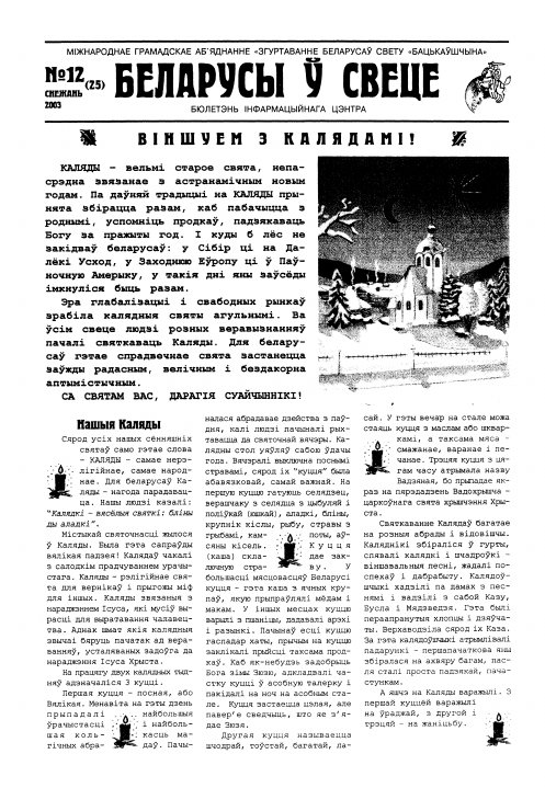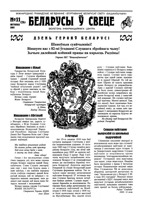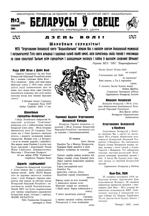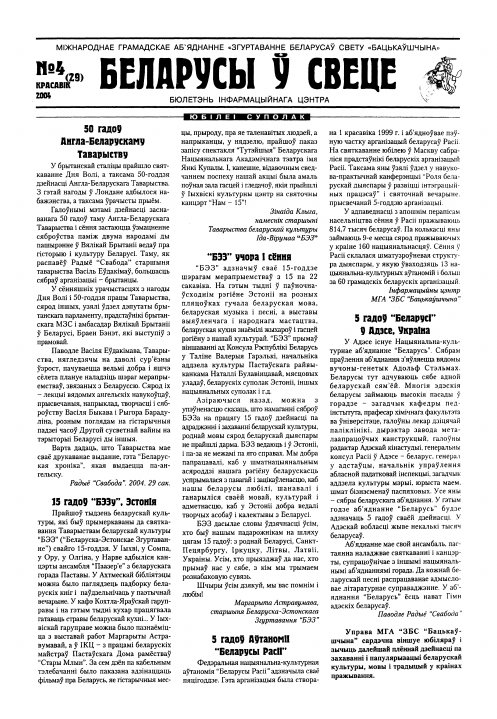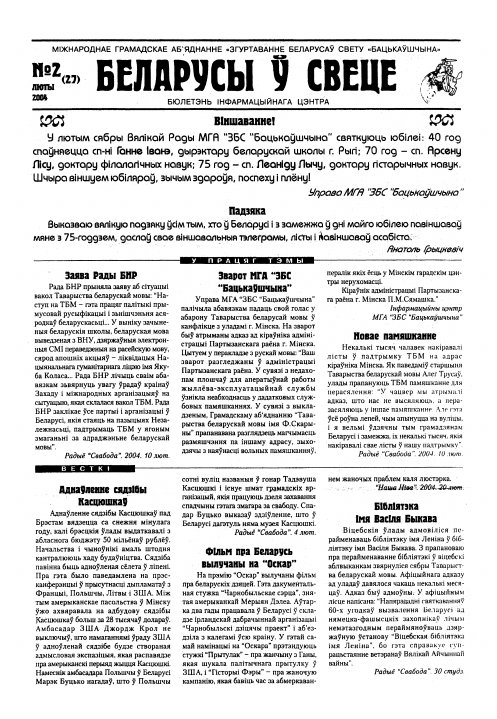 Згуртаванне беларусаў свету «Бацькаўшчына», ЗБС «Бацькаўшчына» — міжнароднае грамадскае аб'яднанне. Створана дзеля захавання беларускай прысутнасці ў свеце, яднання ў адзіную супольнасць усіх беларусаў, павышэння аўтарытэту беларускай нацыі на міжнародным узроўні. Першым Прэзідэнтам ЗБС «Бацькаўшчына» ў 1990 быў абраны Васіль Быкаў, Старшынёй Рады — Яўген Лецка. Першы з'езд беларусаў свету адбыўся 8-10 ліпеня 1993 г. ў Мінску. Прэзідэнт... Болей »