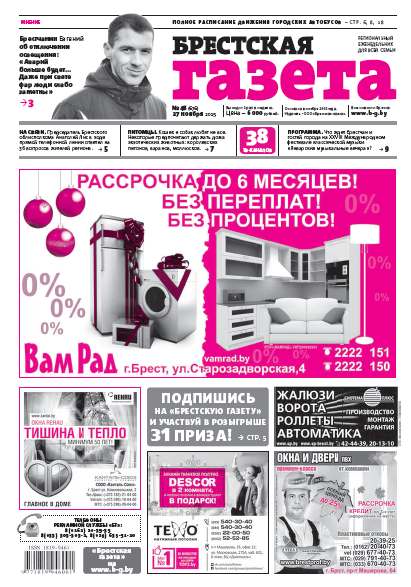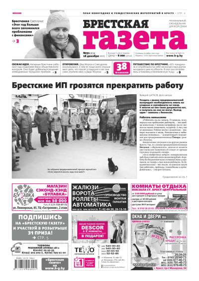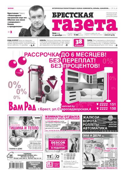 «Брестская газета» на региональном рынке СМИ позиционирует себя как одна газета для всей семьи. При выборе тематики публикуемых материалов мы руководствуемся принципом: ШИРОКИЙ ВЗГЛЯД, ВНИМАНИЕ К ДЕТАЛЯМ. При этом фундаментальной основой всех публикаций является: ОБЪЕКТИВНОСТЬ. Основными составляющими в содержательном плане являются местные новости, материалы социально-бытовой, экономической и правовой направленности. Болей »