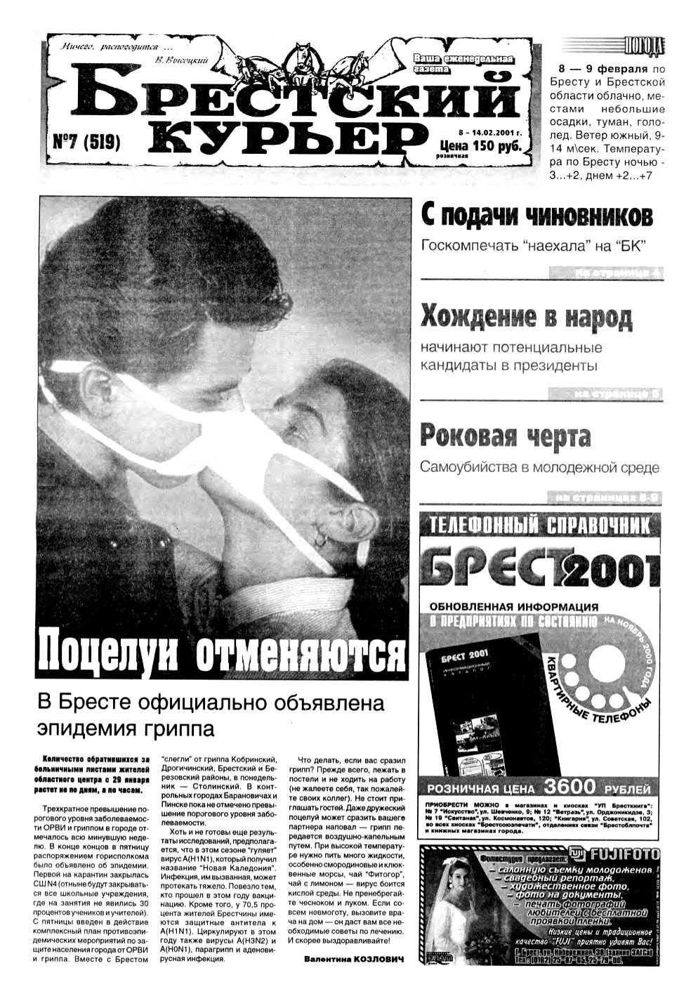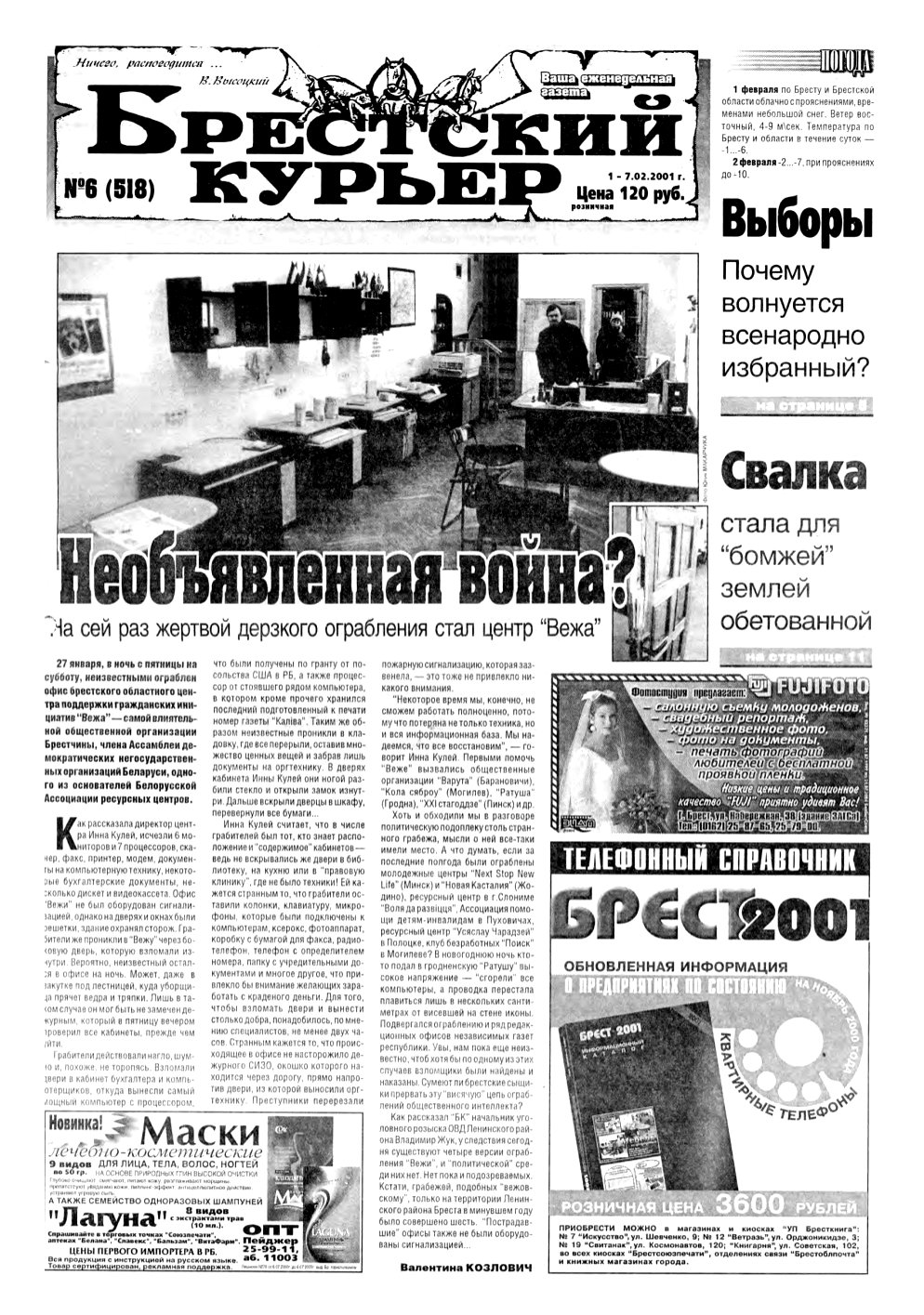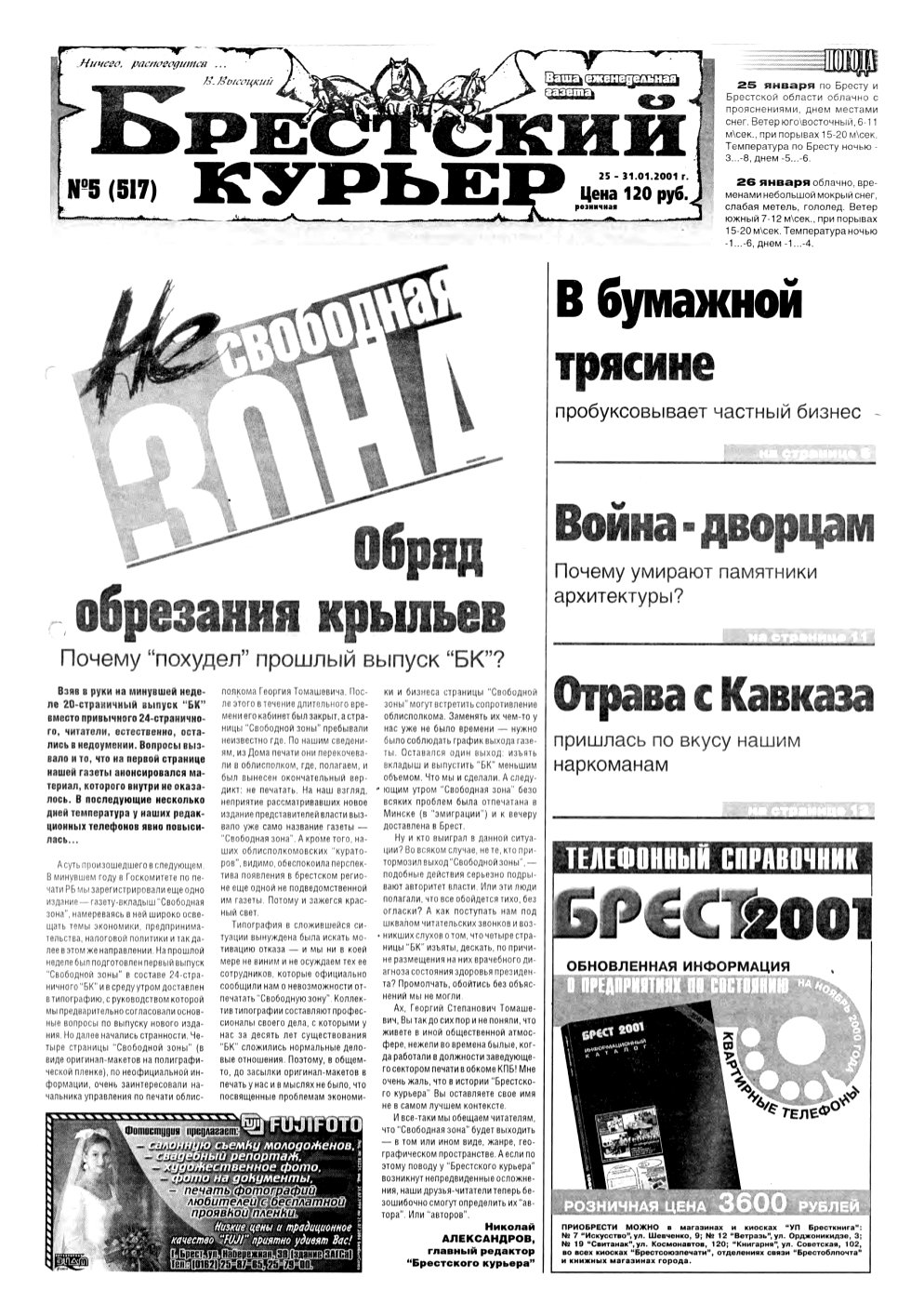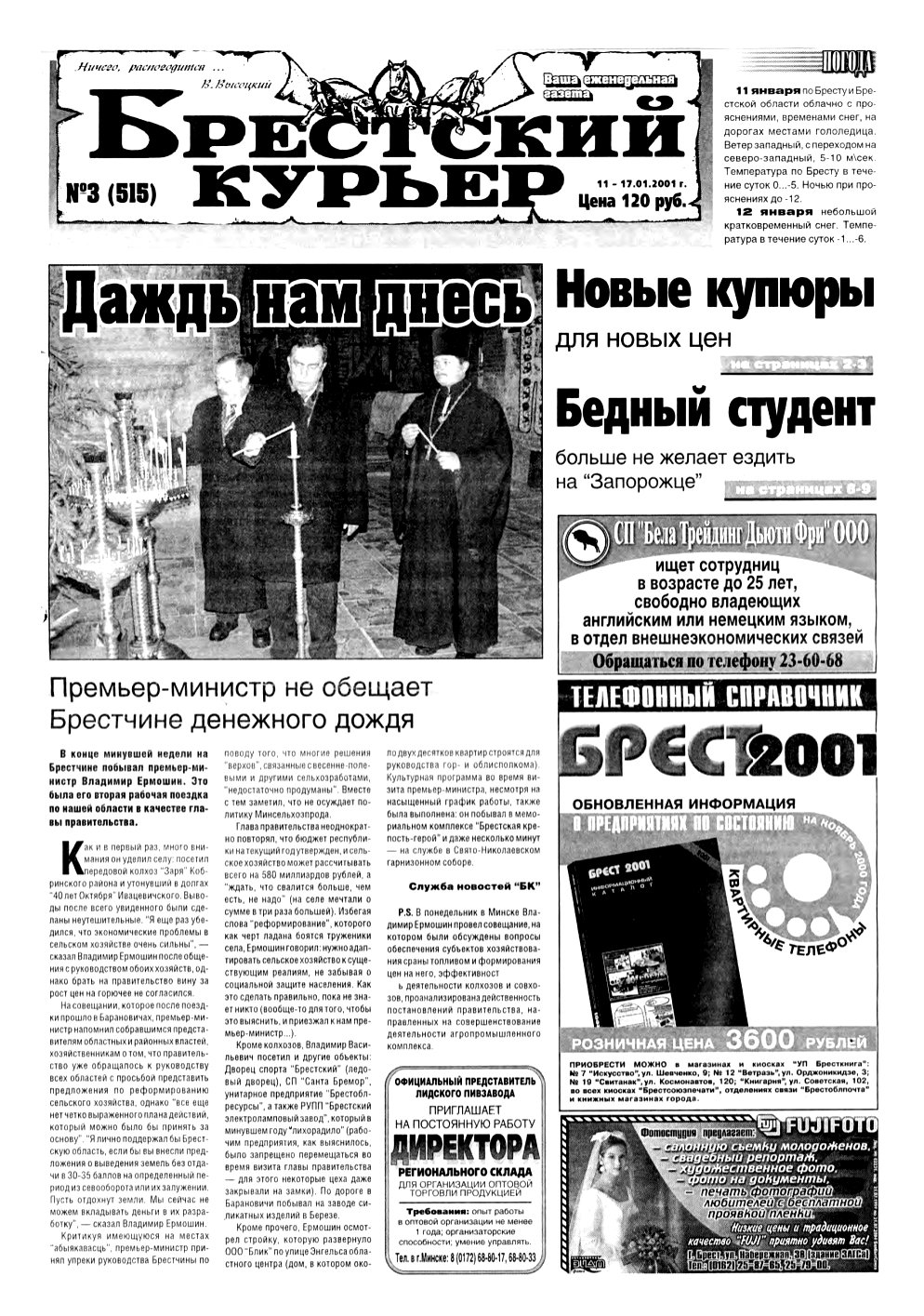 Газета «Брестский курьер» основана в 1990 году. Является информационно-аналитическим еженедельником. Тираж от 15 000. День выхода — среда. Распространение г.Брест и область, по подписке — Республика Беларусь. Формат — А3. Объем — 32 полосы. На страницах газеты "Брестский курьер" постоянно присутствуют новости и комментарии, репортажи с мест событий, журналистские расследования, аналитические обзоры экономики и финансов, мнения политиков... Болей »