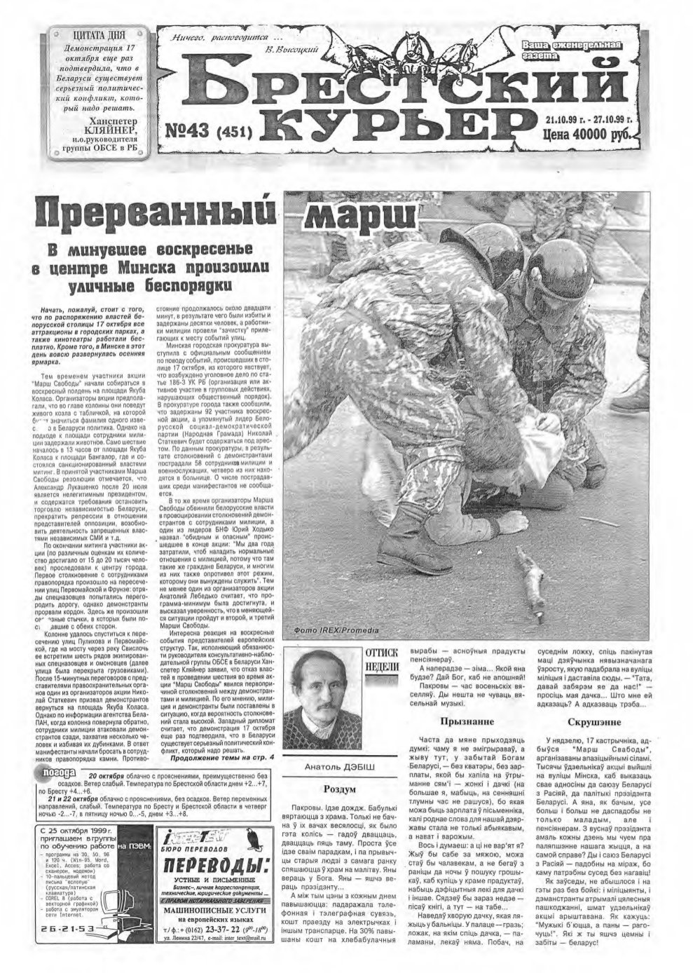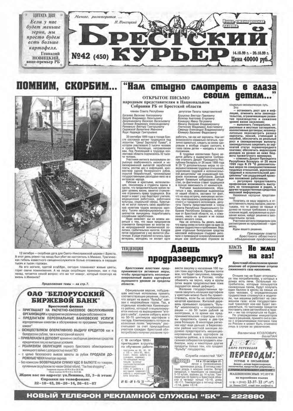 «Брестский курьер» — Ваша еженедельная газета. Газета основана в 1913 возрождена в 1990 г. Рукописи не рецензируются и не возвращаются. Редакция оставляет за собой право не вступать в переписку с читателями. Ответственность за подбор фактов и изложение материалов несут авторы. Высказанные в этих статьях мнения могут не совпадать с точкой зрения редакции "БК" и не налагают на неё никаких обязательств. Выходит один раз в неделю. Газета ра... Болей »