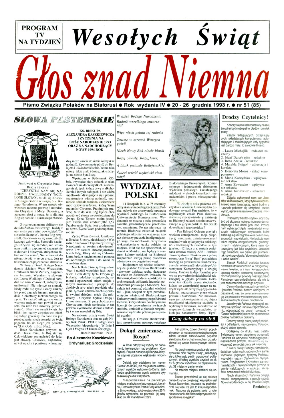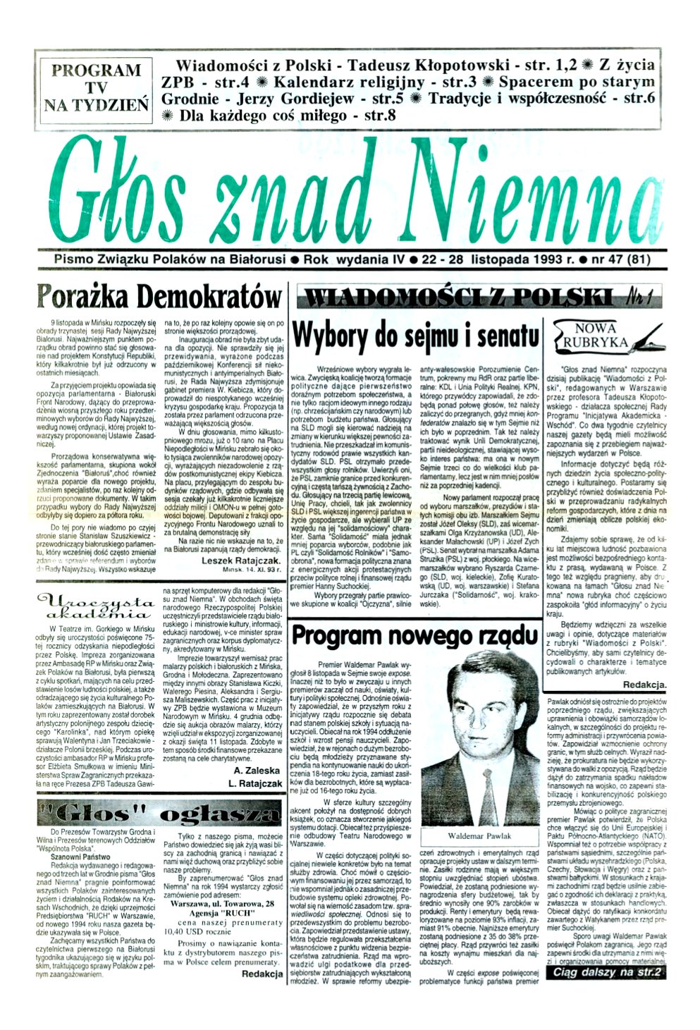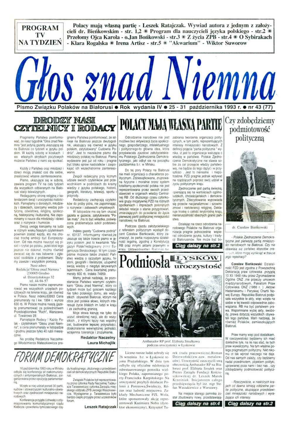 Głos znad Niemna – polskojęzyczny tygodnik wydawany na Białorusi od 3 grudnia 1989 roku; organ prasowy Związku Polaków na Białorusi. Twórcą i pierwszym redaktorem pisma był Eugeniusz Skrobocki z Grodna. Dzięki jego zaangażowaniu pierwsze numery „Głosu znad Niemna” otrzymał Papież Jan Paweł II podczas prywatnej audiencji władz Związku w Watykanie w roku 1990. Pierwszy numer ukazał się jako dodatek specjalny do Czerwonego Sztandaru z okaz... Болей »