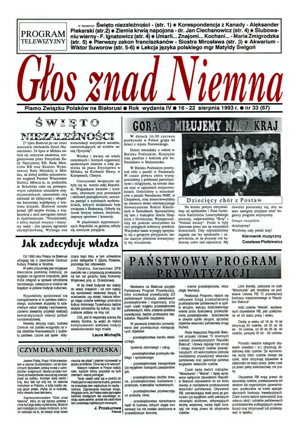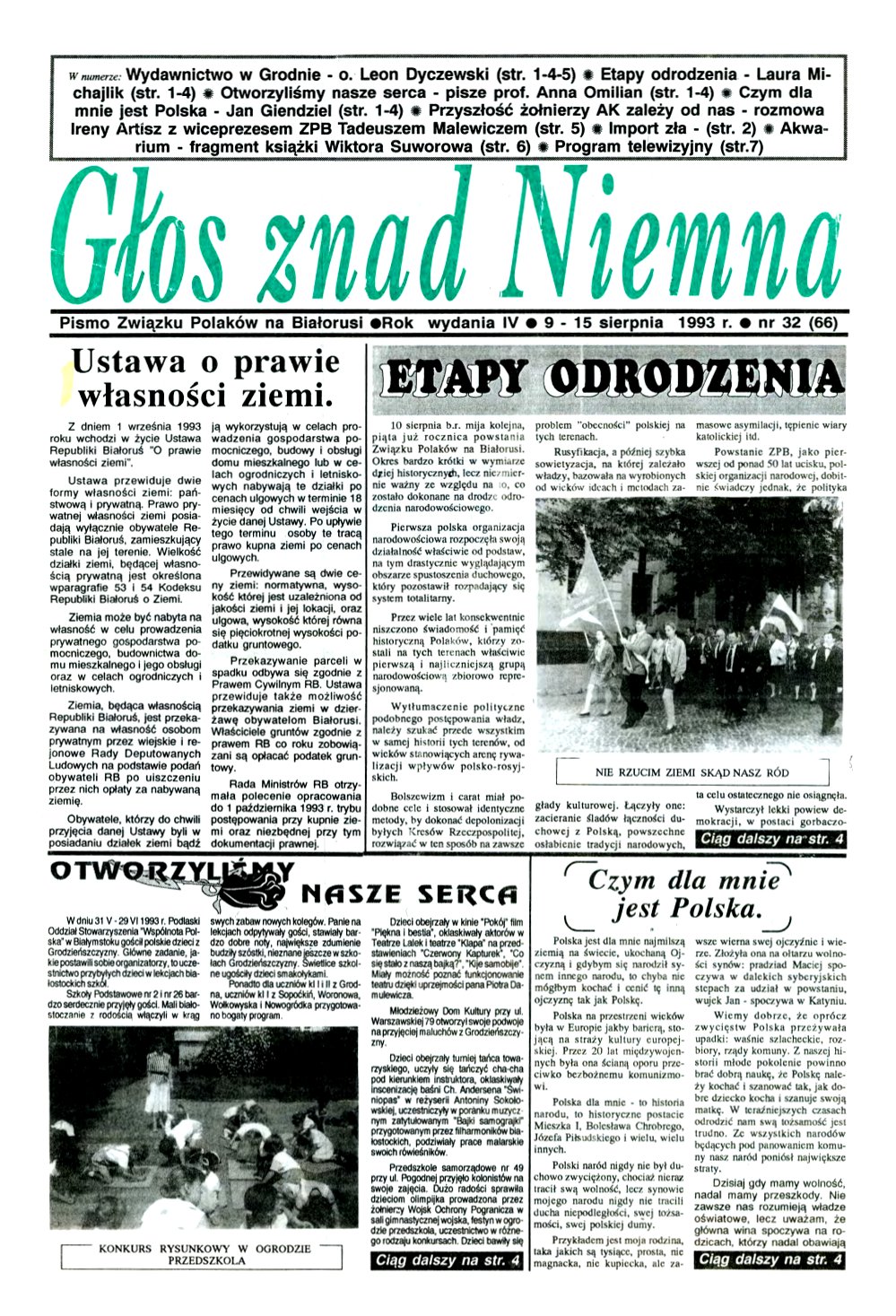 «Głos znad Niemna» — polskojęzyczny tygodnik wydawany na Białorusi od 3 grudnia 1989 roku; organ prasowy Związku Polaków na Białorusi. Twórcą i pierwszym redaktorem pisma był Eugeniusz Skrobocki z Grodna. Dzięki jego zaangażowaniu pierwsze numery „Głosu znad Niemna” otrzymał Papież Jan Paweł II podczas prywatnej audiencji władz Związku w Watykanie w roku 1990. Pierwszy numer ukazał się jako dodatek specjalny do Czerwonego Sztandaru z ok... Болей »
