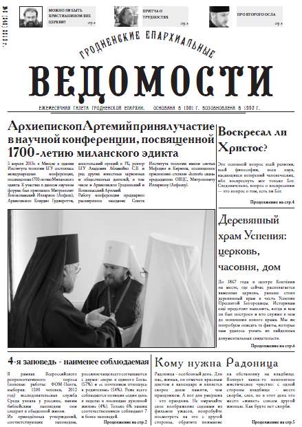 Минске в здании Института теологии БГУ состоялась международная конференция, посвященная 1700-летию Миланского эдикта. К участию в данном научном форуме был приглашен Митрополит Волоколамский Илларион (Алфеев), Архиепископ Клаудио Гуджеротти, апостольский нунций в РБ, ректор БГУ Академик Абламейко С.В. и ряд других известных церковных и общественных деятелей, в том числе и Архиепископ Гродненский и Волковысский Артемий. Болей »