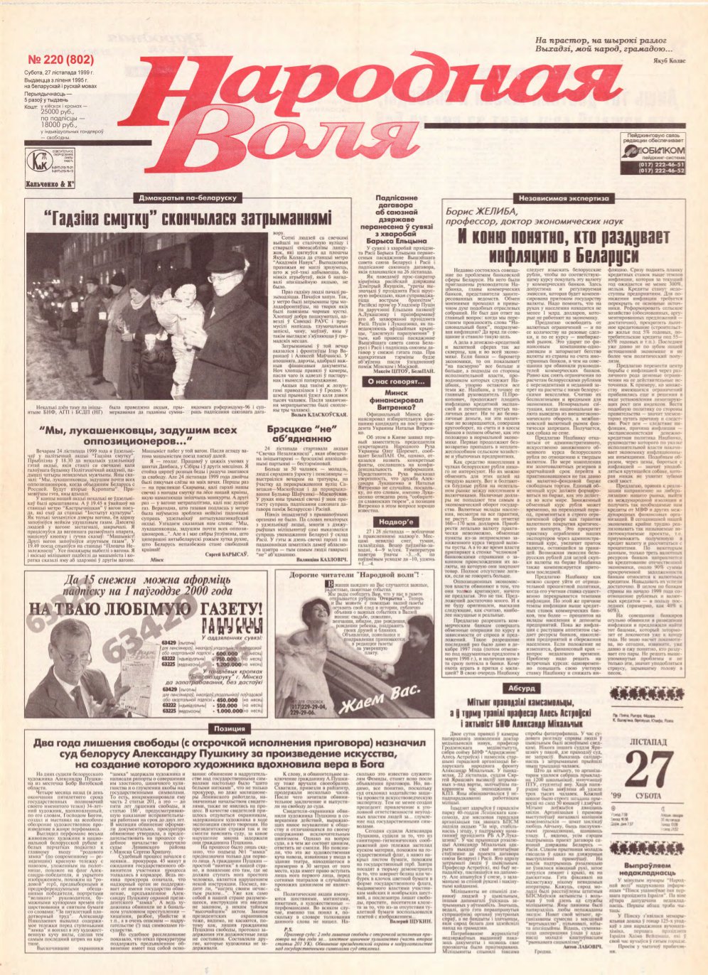 «Народная Воля» — беларуская грамадска-палітычная газета, выдаецца з ліпеня 1995 года на беларускай і рускай мовах. Перыядычнасць - 5 разоў у тыдзень. Створана Іосіфам Сярэдзічам, які дагэтуль працаваў галоўным рэдактарам «Народнай газеты» — афіцыйнай газеты Вярхоўнага Савета Рэспублікі Беларусь (законнага парламента). Газета займала ўмераную цэнтрысцкую пазіцыю, імкнучыся адлюстраваць палітычныя погляды большасці грамадзян. Болей »