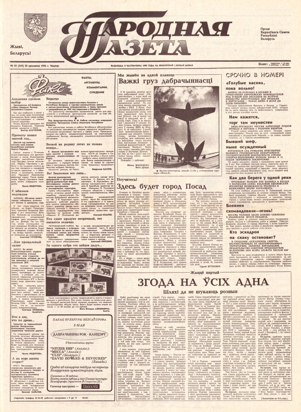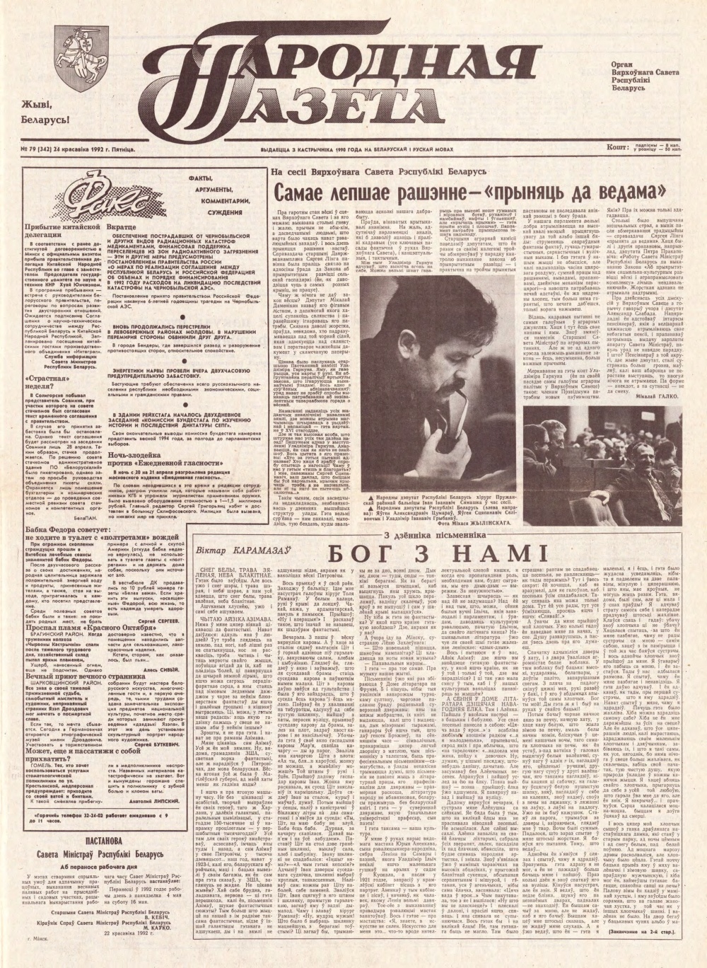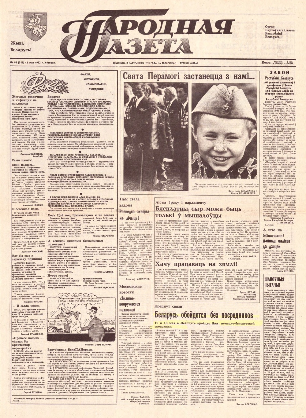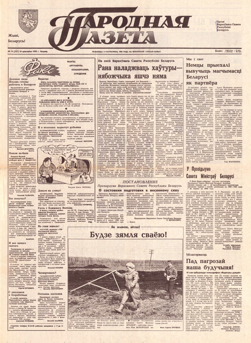 «Народная газета» — орган Вярхоўнага Савета Рэспублікі Беларусь. Выдавец: Адкрытае акцыянернае таварыства Народная газета. Выходзіць штодзённа, акрамя нядзелі і панядзелка, 250 разоў у год. Выдаецца з кастрычніка 1990 года на беларускай і рускай мовах. З 1990 па 1995 год пасаду галоўнага рэдактара «Народнай газеты» займаў Іосіф Сярэдзіч. З мая 1990 па студзень 1996 — дэпутат Вярхоўнага Савета XII склікання. Выданне займала ўмераную цэнт... Болей »