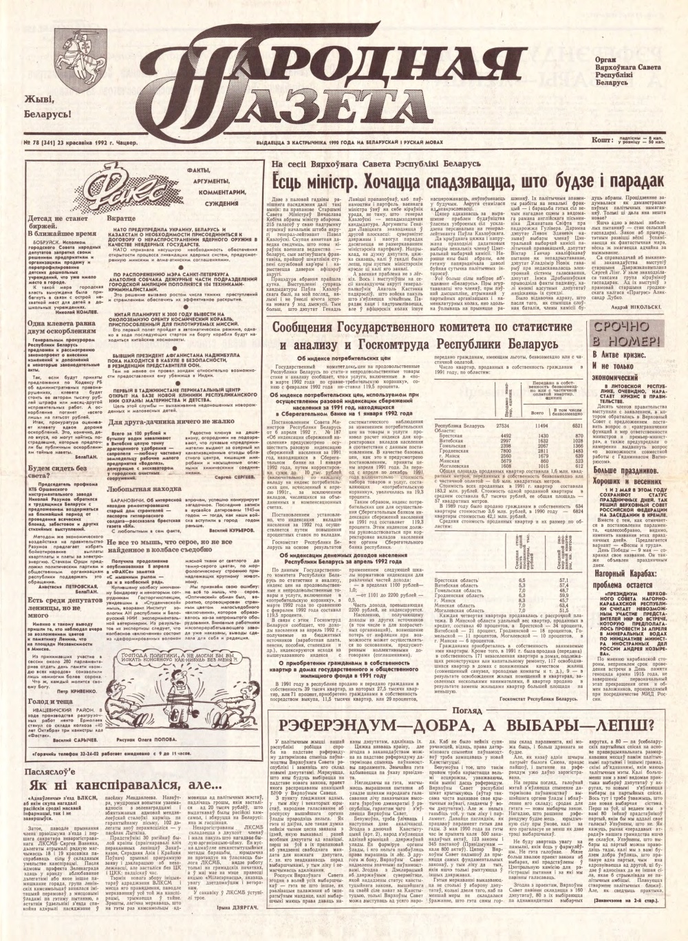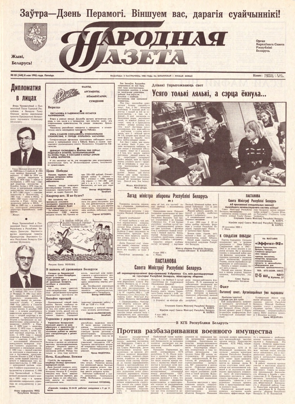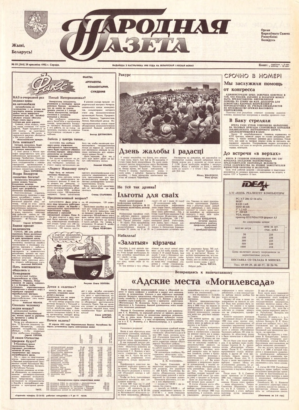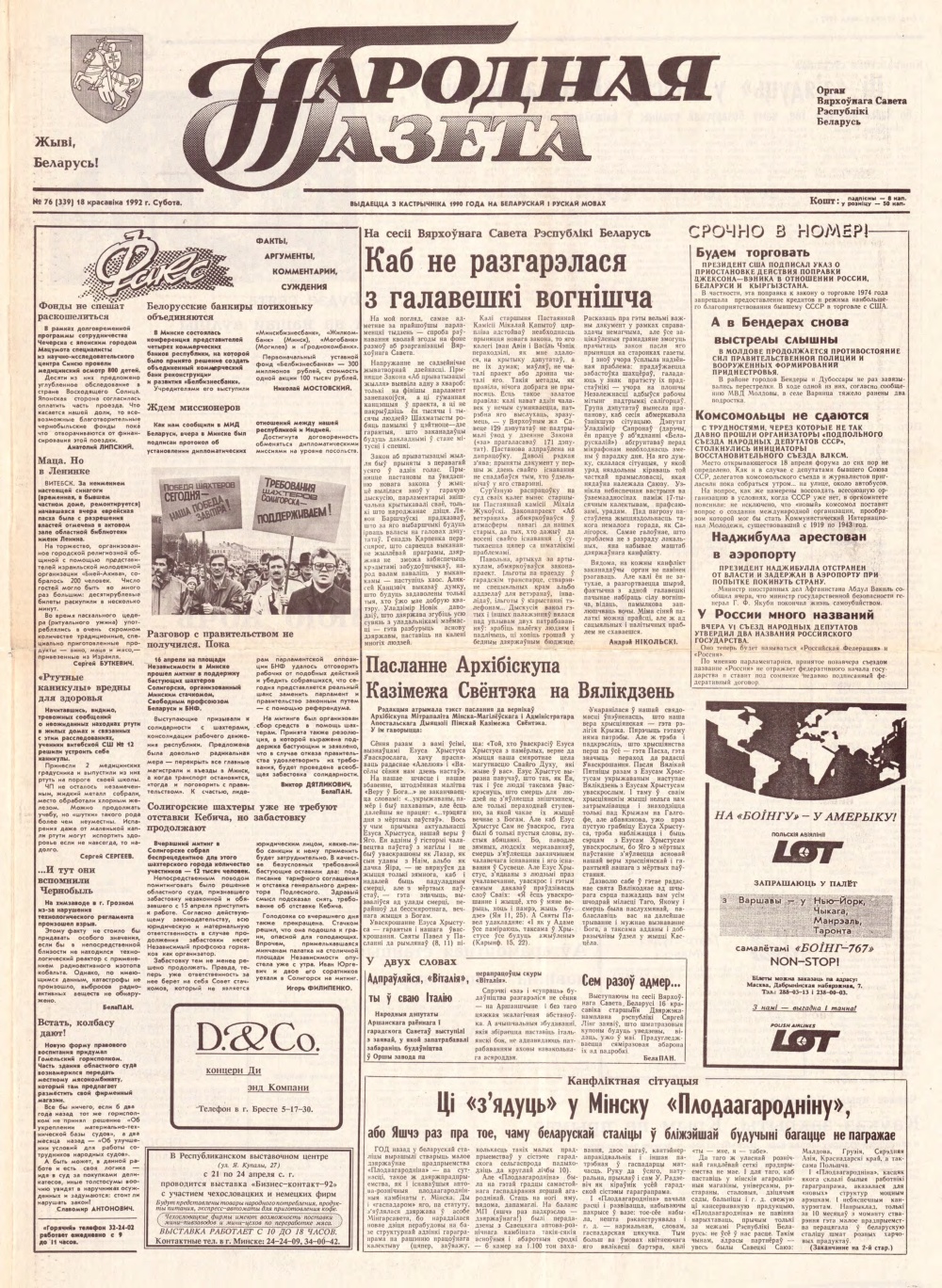 «Народная газета» — орган Вярхоўнага Савета Рэспублікі Беларусь. Выдавец: Адкрытае акцыянернае таварыства Народная газета. Выходзіць штодзённа, акрамя нядзелі і панядзелка, 250 разоў у год. Выдаецца з кастрычніка 1990 года на беларускай і рускай мовах. З 1990 па 1995 год пасаду галоўнага рэдактара «Народнай газеты» займаў Іосіф Сярэдзіч. З мая 1990 па студзень 1996 — дэпутат Вярхоўнага Савета XII склікання. Выданне займала ўмераную цэнт... Болей »