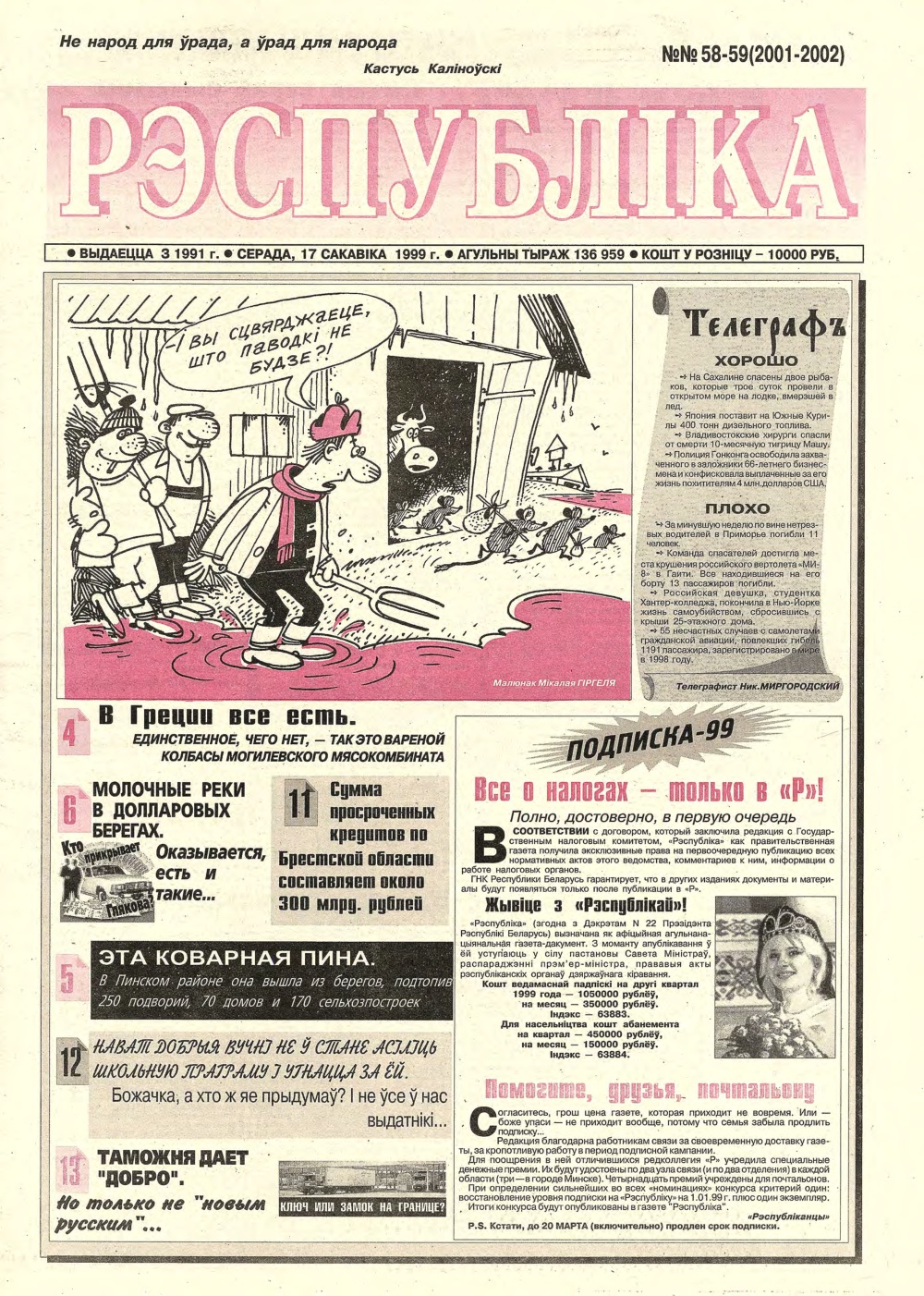 «Рэспубліка» — газета для тых, хто самастойна прымае рашэнні. Заснавальнік - Савет Міністраў Рэспублікі Беларусь. Выдаецца з чэрвеня 1991. Газета выходзіць 250 разоў у год. Аўтары апублікаваных матэрыялаў нясуць адказнасць за падбор і дакладнасць фактаў, іх меркаванні неабавязкова адлюстроўваюць пункт гледжання рэдакцыі. Рукапісы, фотаздымкі і малюнкі не рэцэнзуюцца і не вяртаюцца. Болей »