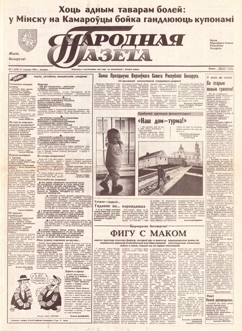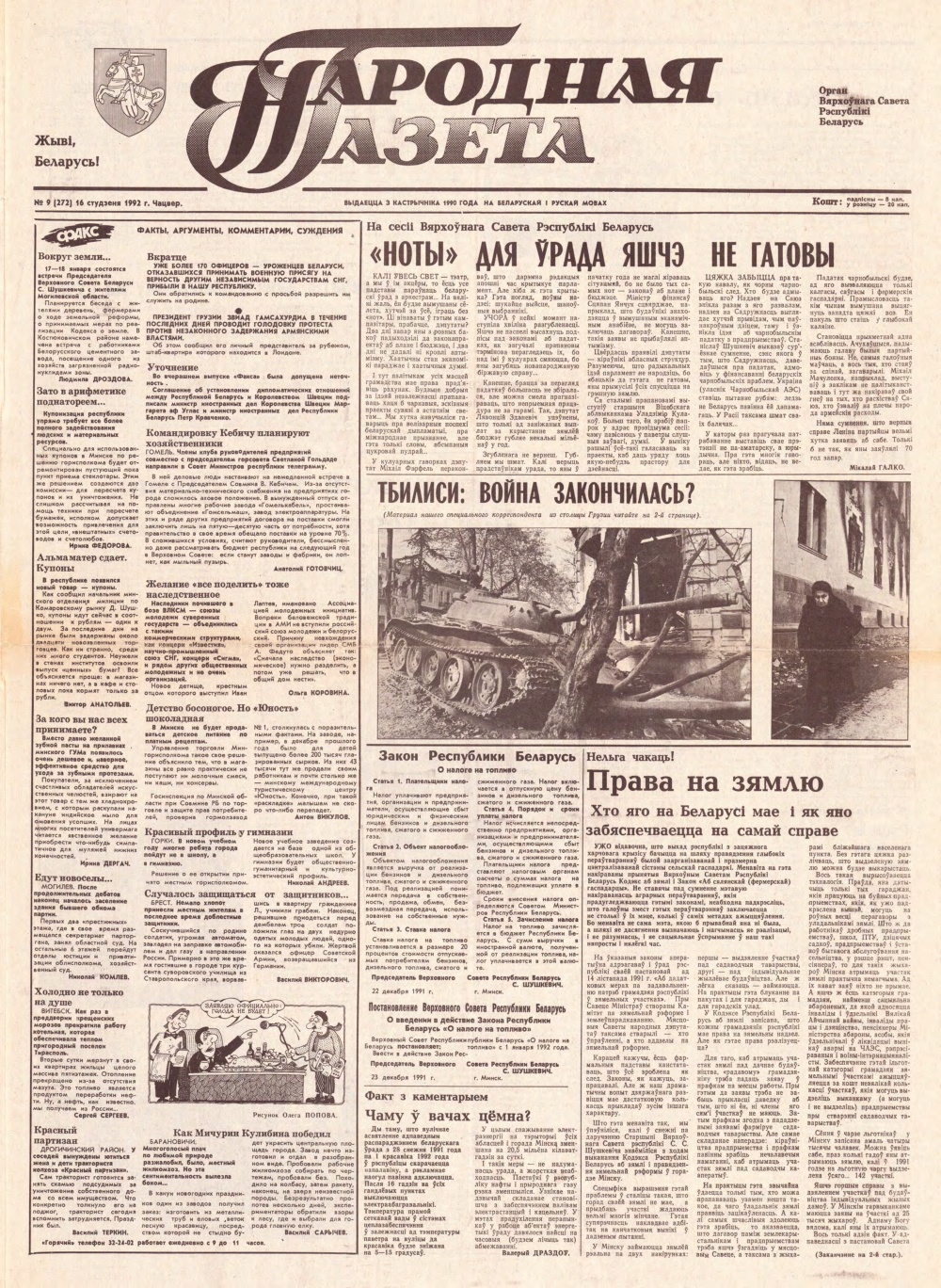 «Народная газета» — орган Вярхоўнага Савета Рэспублікі Беларусь. Выдавец: Адкрытае акцыянернае таварыства Народная газета. Выходзіць штодзённа, акрамя нядзелі і панядзелка, 250 разоў у год. Выдаецца з кастрычніка 1990 года на беларускай і рускай мовах. З 1990 па 1995 год пасаду галоўнага рэдактара «Народнай газеты» займаў Іосіф Сярэдзіч. З мая 1990 па студзень 1996 — дэпутат Вярхоўнага Савета XII склікання. Выданне займала ўмераную цэнт... Болей »