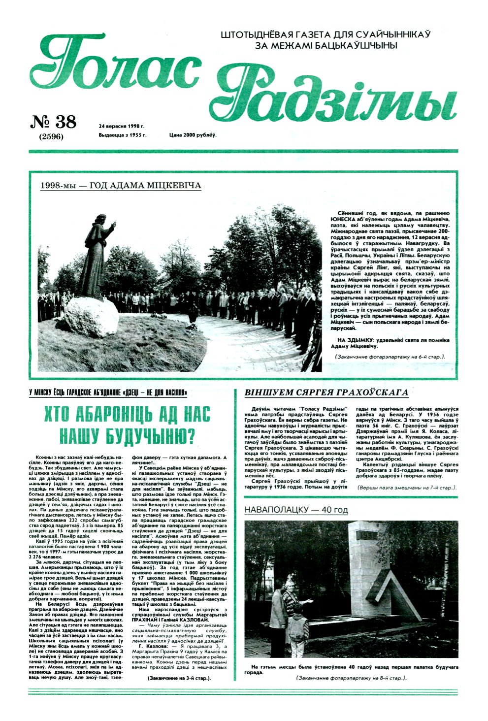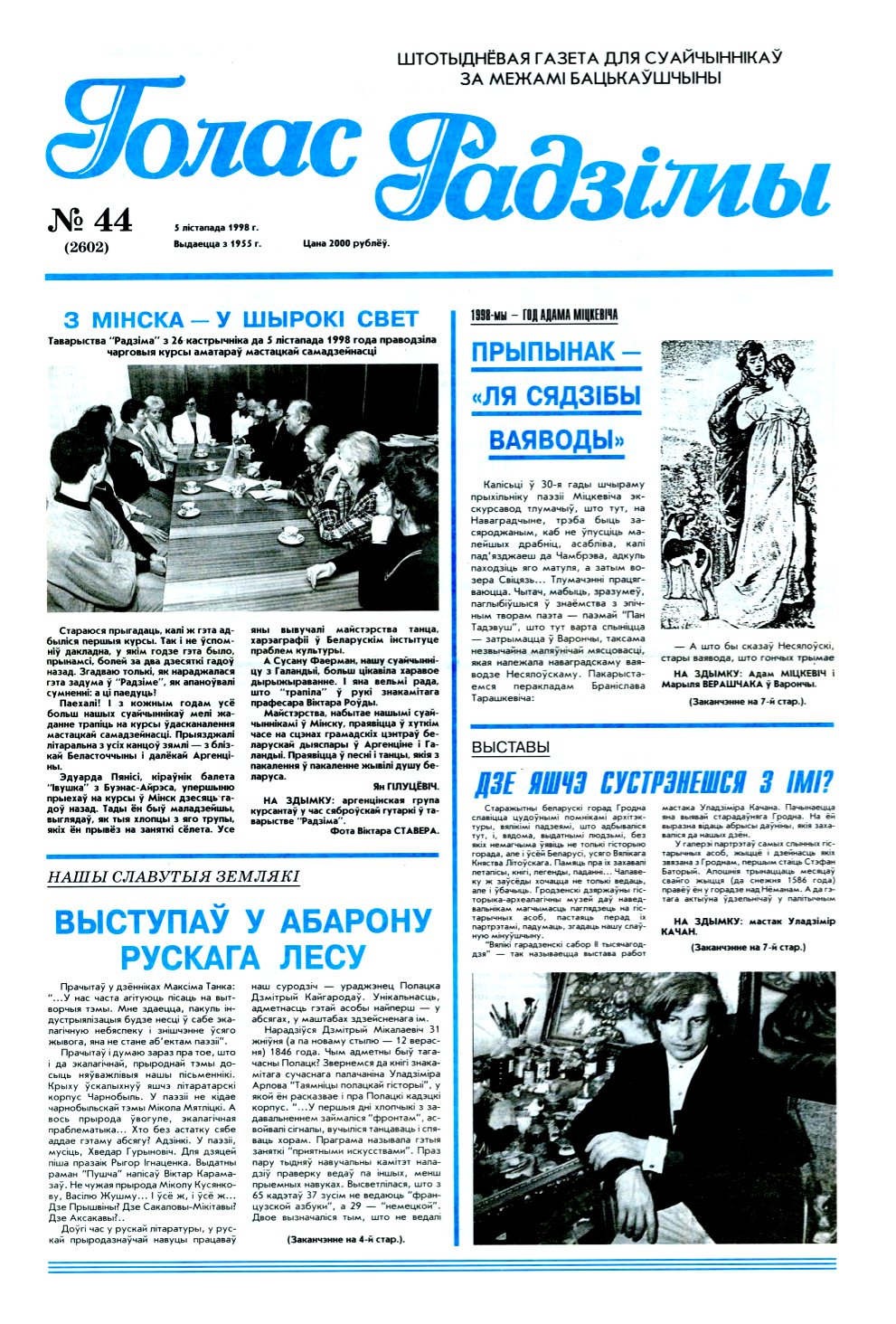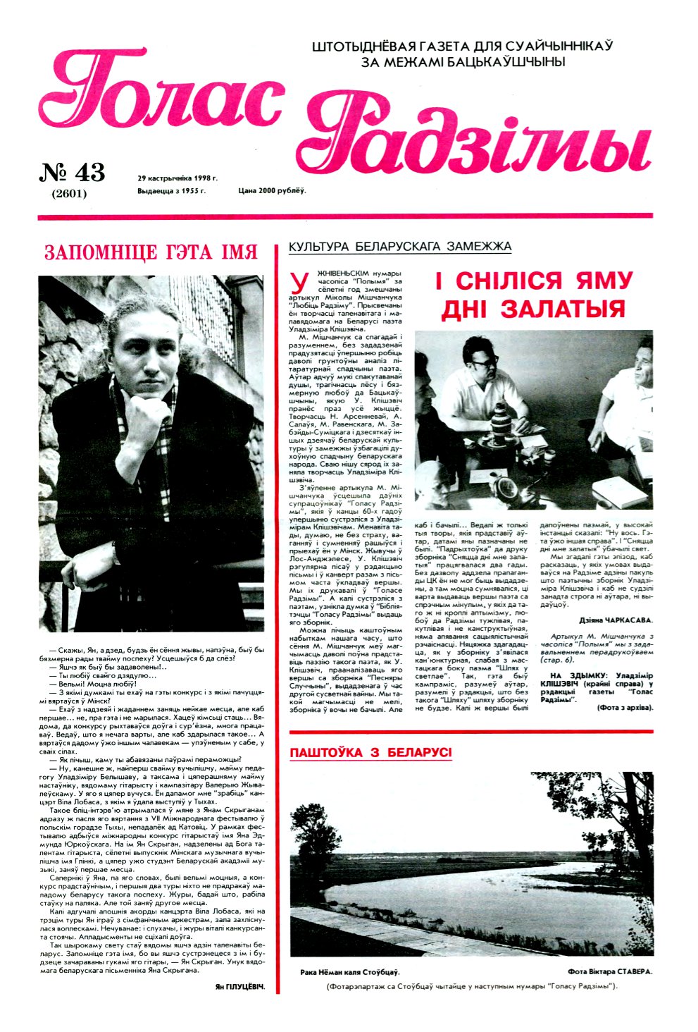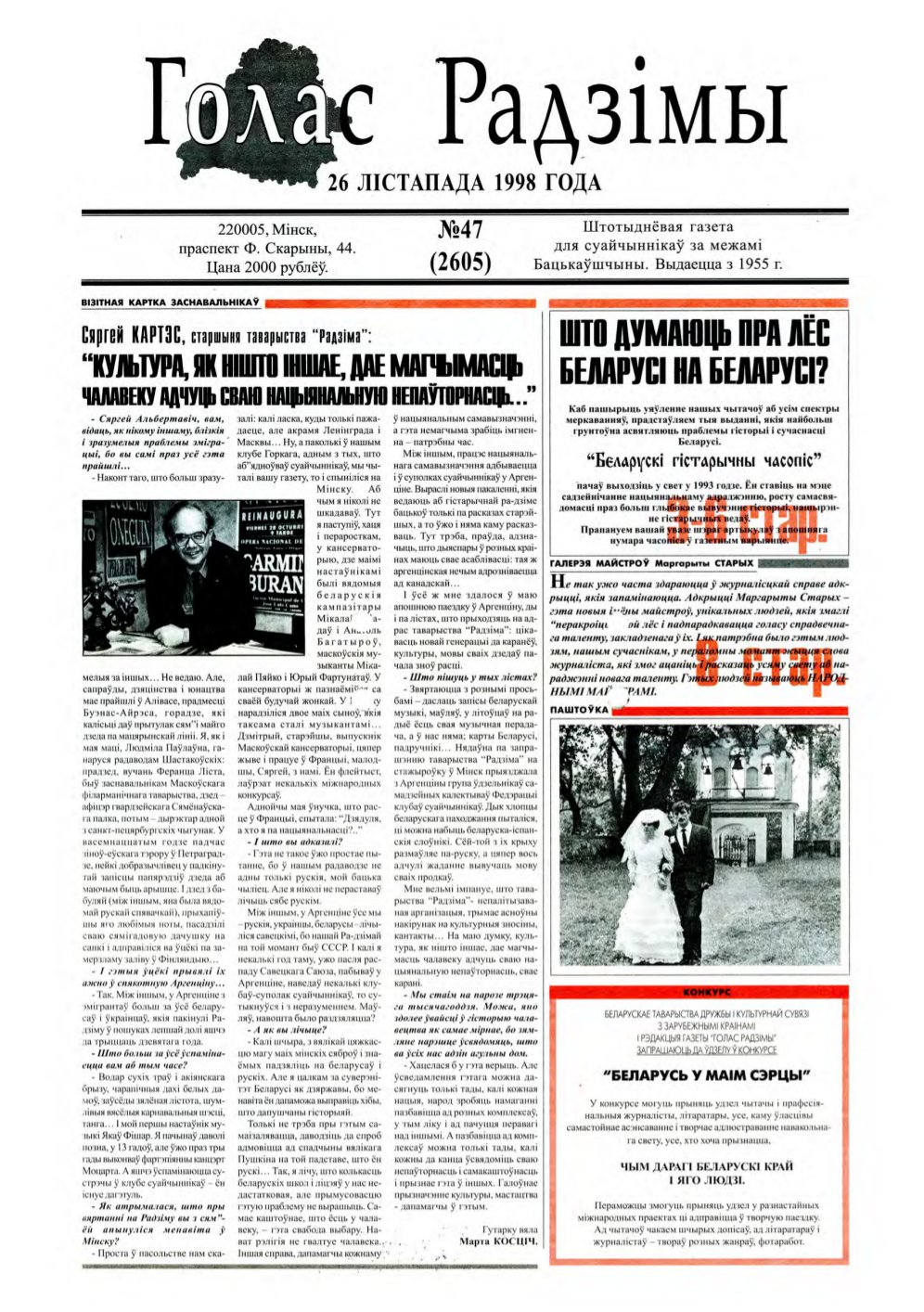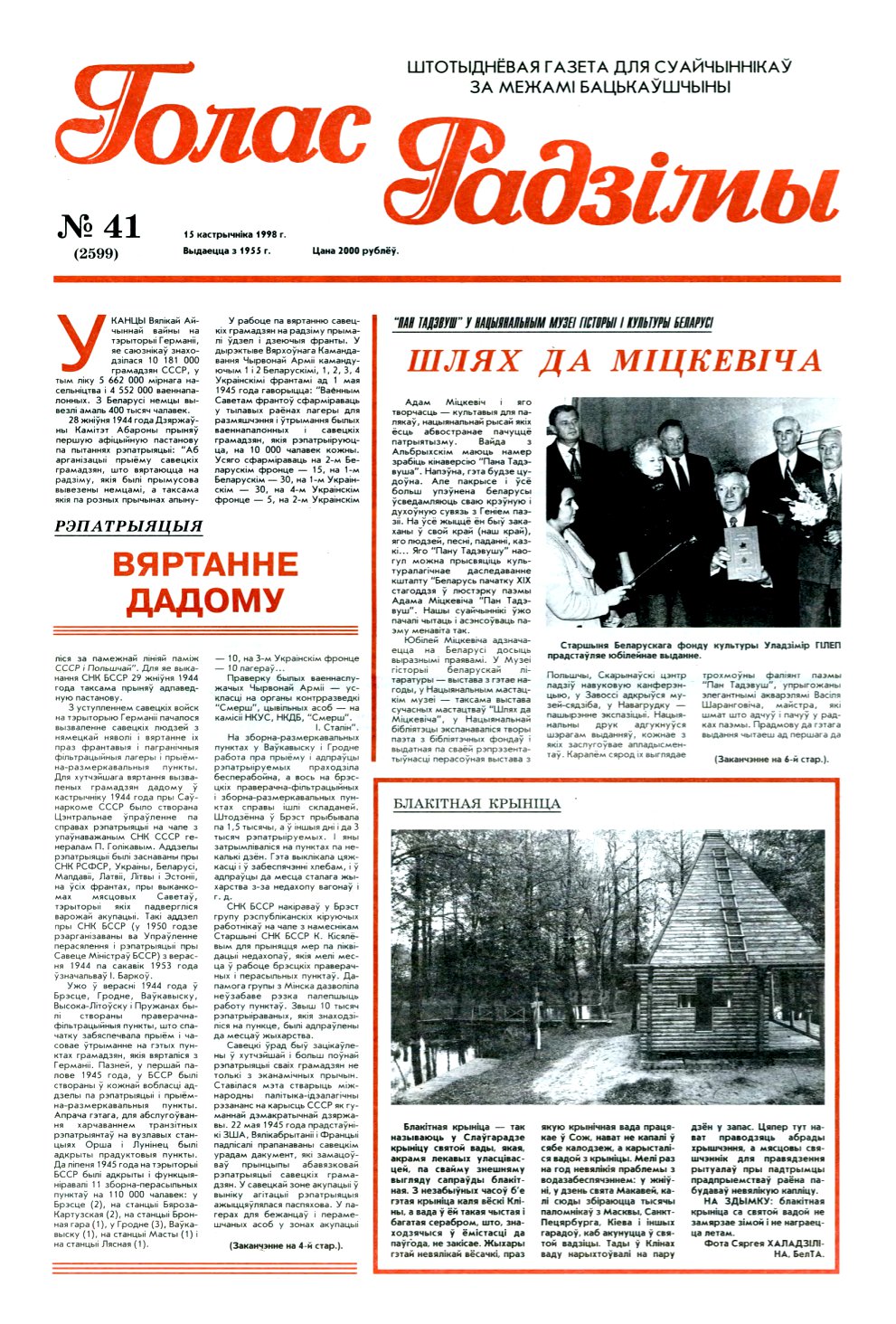 «Голас Радзімы» — штотыднёвая газета Беларускага таварыства Радзіма; інфармацыйна-асветная газета для беларусаў за мяжой. Выдаецца з 6 красавіка 1955 года ў Мінску на беларускай мове штотыднёва. Да студзеня 1960 года называлася «За вяртанне на Радзіму». З сярэдзіны 1970-х гадоў асвятляла жыццё, у тым ліку беларускай эміграцыі. З сярэдзіны 1990-х гадоў адзінае беларускае выданне, якое распаўсюджвалася сярод нацыянальнай дыяспары і ў асяр... Болей »
