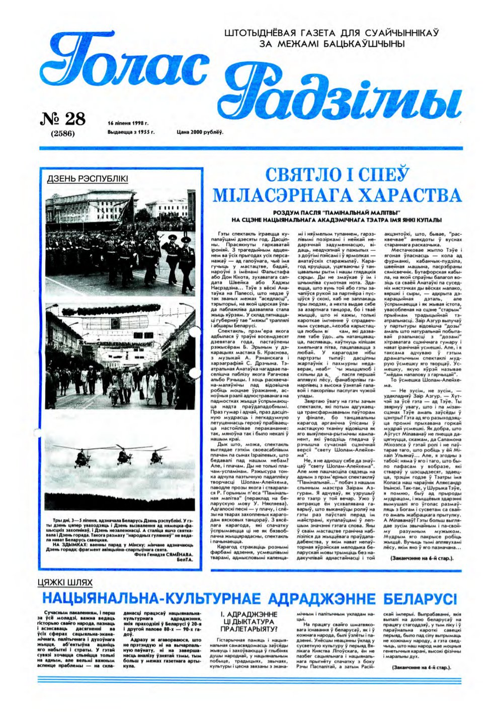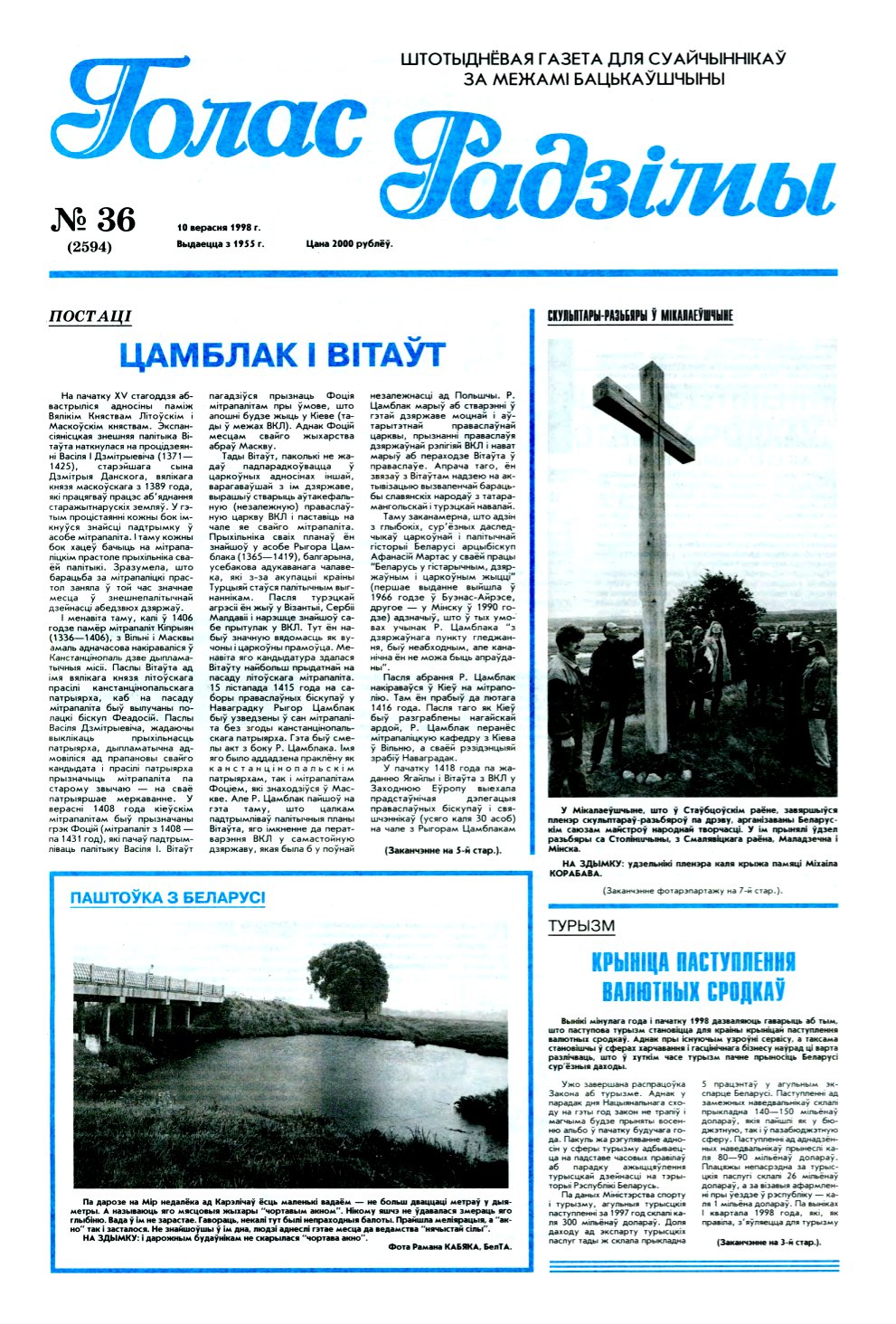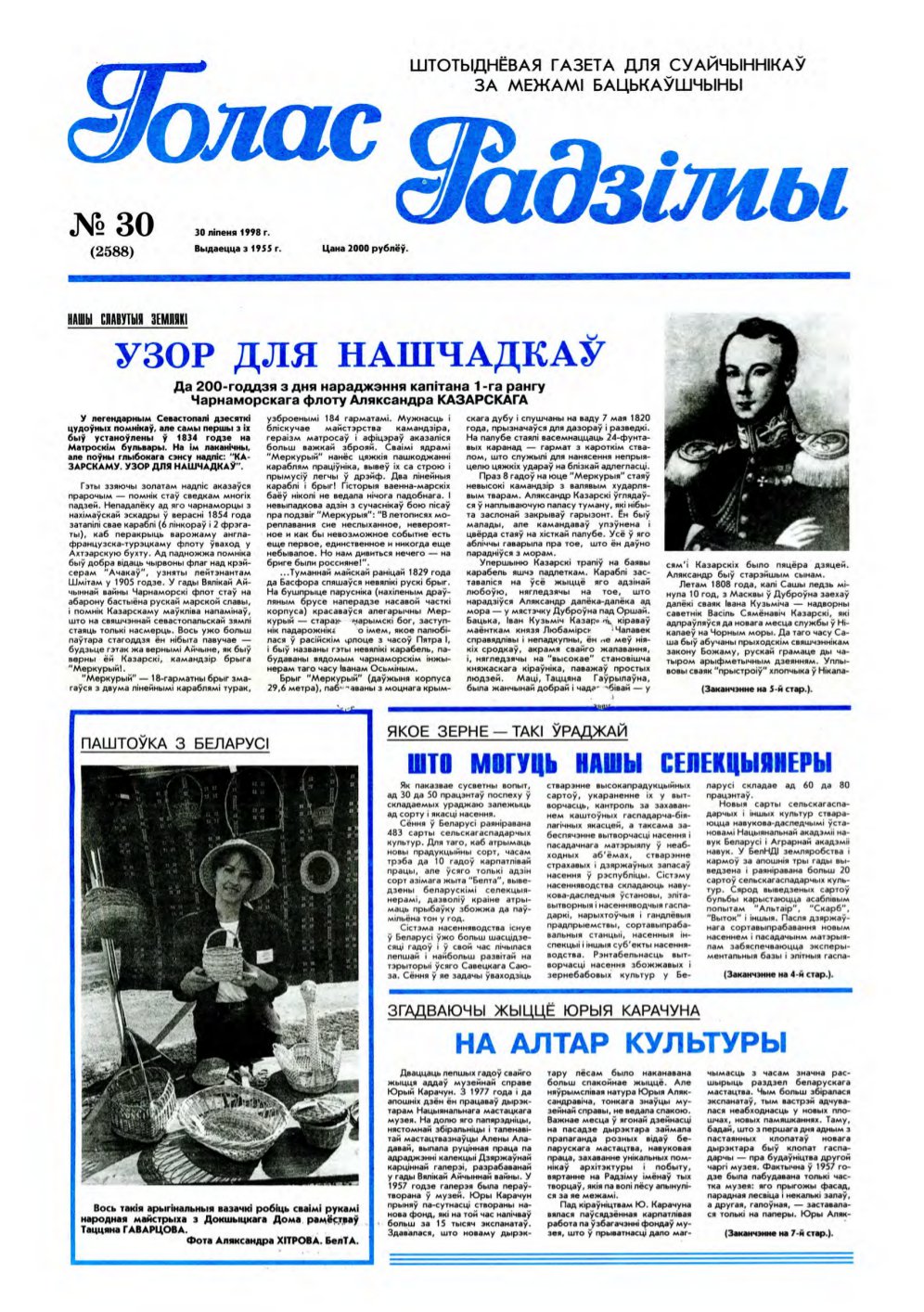 «Голас Радзімы» — штотыднёвая газета Беларускага таварыства Радзіма; інфармацыйна-асветная газета для беларусаў за мяжой. Выдаецца з 6 красавіка 1955 года ў Мінску на беларускай мове штотыднёва. Да студзеня 1960 года называлася «За вяртанне на Радзіму». З сярэдзіны 1970-х гадоў асвятляла жыццё, у тым ліку беларускай эміграцыі. З сярэдзіны 1990-х гадоў адзінае беларускае выданне, якое распаўсюджвалася сярод нацыянальнай дыяспары і ў асяр... Болей »