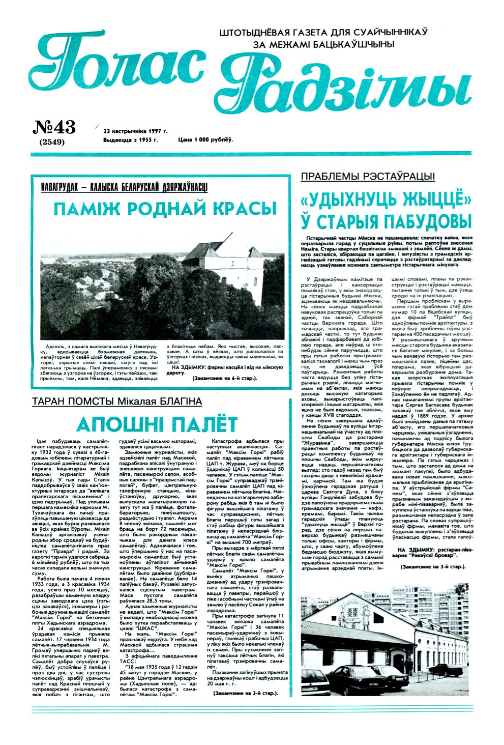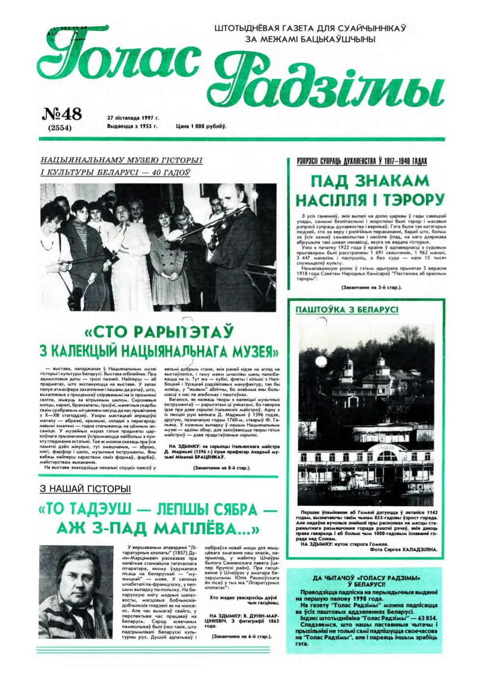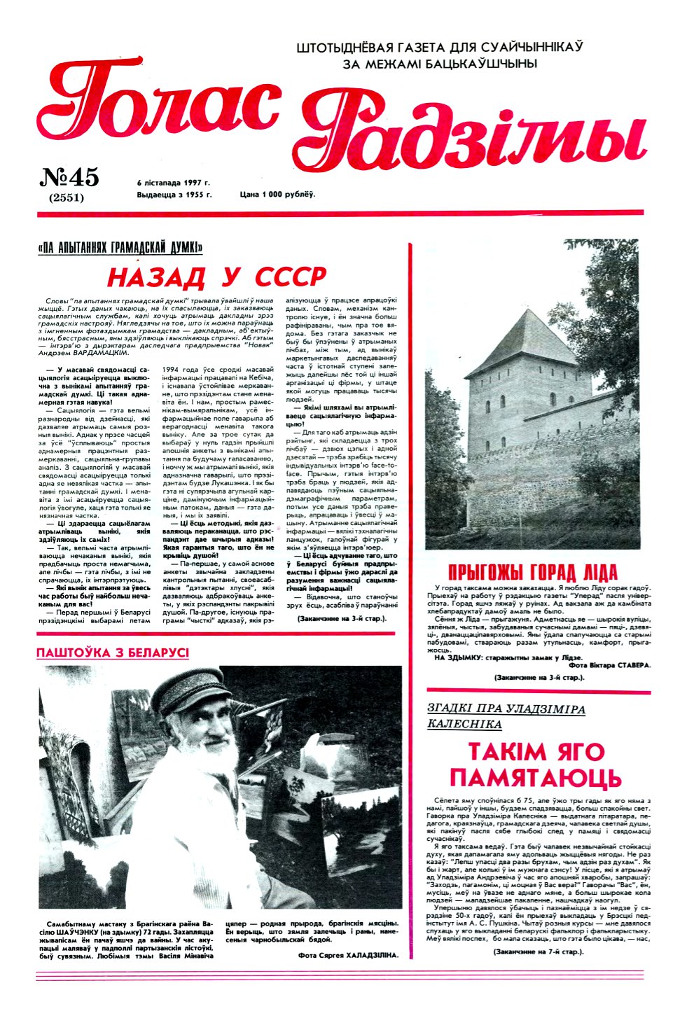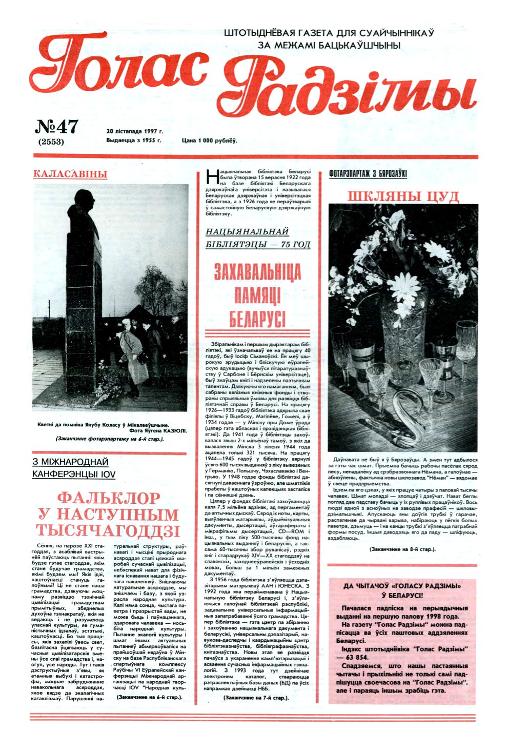 «Голас Радзімы» — штотыднёвая газета Беларускага таварыства Радзіма; інфармацыйна-асветная газета для беларусаў за мяжой. Выдаецца з 6 красавіка 1955 года ў Мінску на беларускай мове штотыднёва. Да студзеня 1960 года называлася «За вяртанне на Радзіму». З сярэдзіны 1970-х гадоў асвятляла жыццё, у тым ліку беларускай эміграцыі. З сярэдзіны 1990-х гадоў адзінае беларускае выданне, якое распаўсюджвалася сярод нацыянальнай дыяспары і ў асяр... Болей »