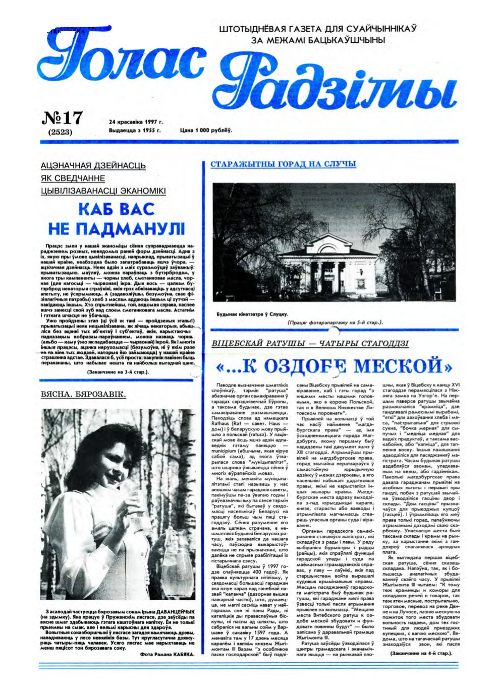 «Голас Радзімы» — штотыднёвая газета Беларускага таварыства Радзіма; інфармацыйна-асветная газета для беларусаў за мяжой. Выдаецца з 6 красавіка 1955 года ў Мінску на беларускай мове штотыднёва. Да студзеня 1960 года называлася «За вяртанне на Радзіму». З сярэдзіны 1970-х гадоў асвятляла жыццё, у тым ліку беларускай эміграцыі. З сярэдзіны 1990-х гадоў адзінае беларускае выданне, якое распаўсюджвалася сярод нацыянальнай дыяспары і ў асяр... Болей »