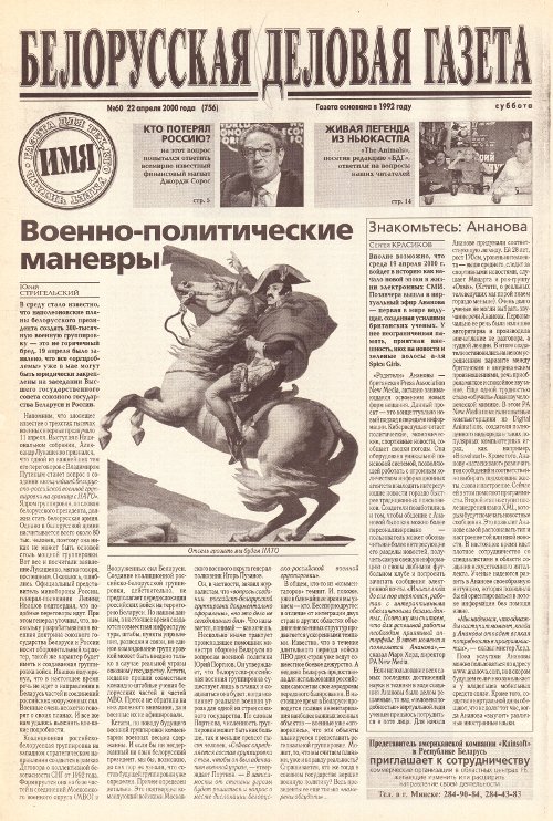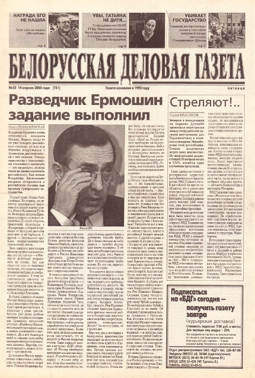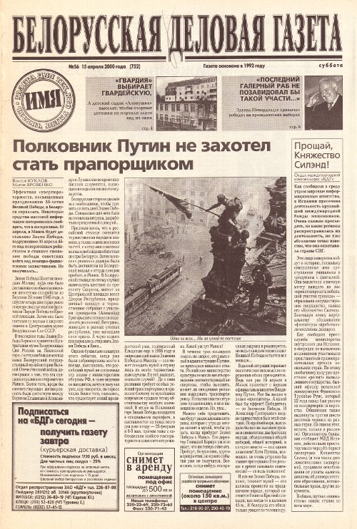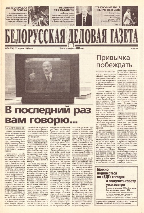 «Белорусская деловая газета» (па-беларуску: «Беларуская дзелавая газэта») — беларуская грамадзка-палітычная газэта, заснаваная ў 1992 годзе. Заснавальнікам і выдаўцом «БДГ» зьяўляецца Выдавецкае прыватнае вунітарнае прадпрыемства «Марат». «БДГ» — штодзённае незалежнае выданьне дзелавых і палітычных кругоў Беларусі. «БДГ» зьяўляецца адным з найболей аўтарытэтных незалежных СМІ Беларусі. За час дзейнасьці газэты ўладамі неаднаразова прадп... More »