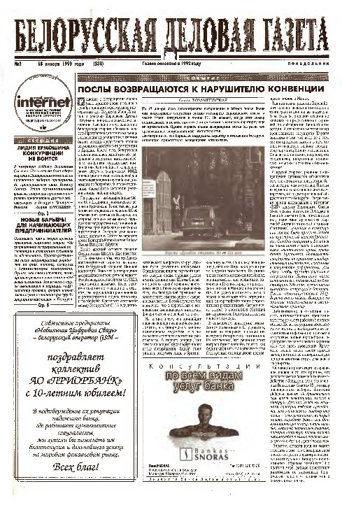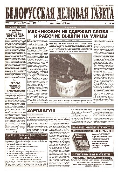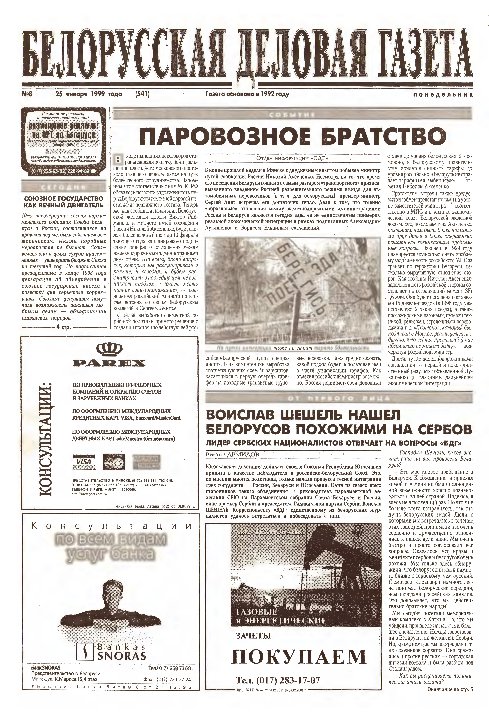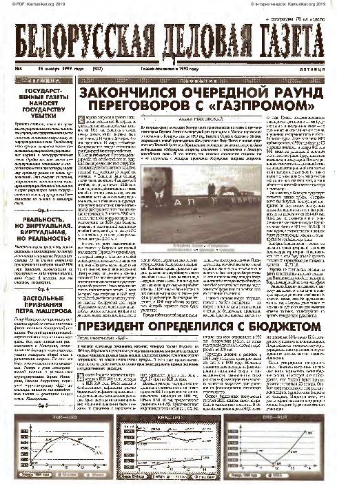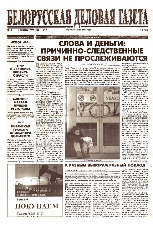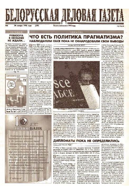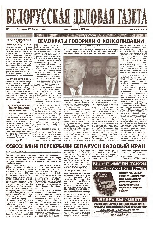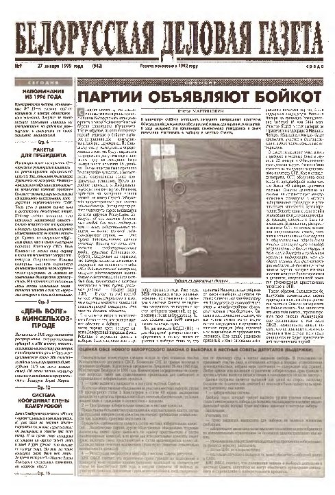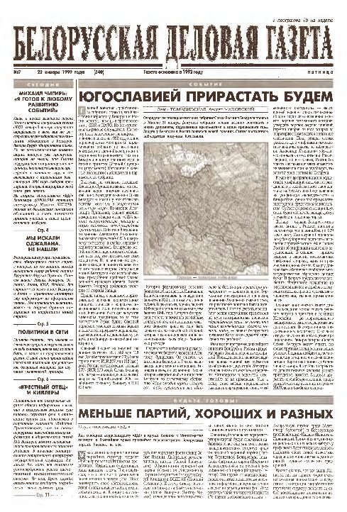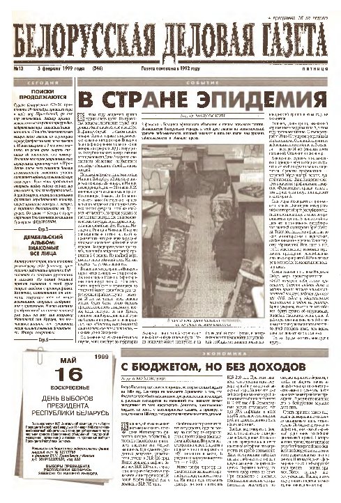 «Белорусская деловая газета» (па-беларуску: «Беларуская дзелавая газэта») — беларуская грамадзка-палітычная газэта, заснаваная ў 1992 годзе. Заснавальнікам і выдаўцом «БДГ» зьяўляецца Выдавецкае прыватнае вунітарнае прадпрыемства «Марат». «БДГ» — штодзённае незалежнае выданьне дзелавых і палітычных кругоў Беларусі. «БДГ» зьяўляецца адным з найболей аўтарытэтных незалежных СМІ Беларусі. За час дзейнасьці газэты ўладамі неаднаразова прадп... More »