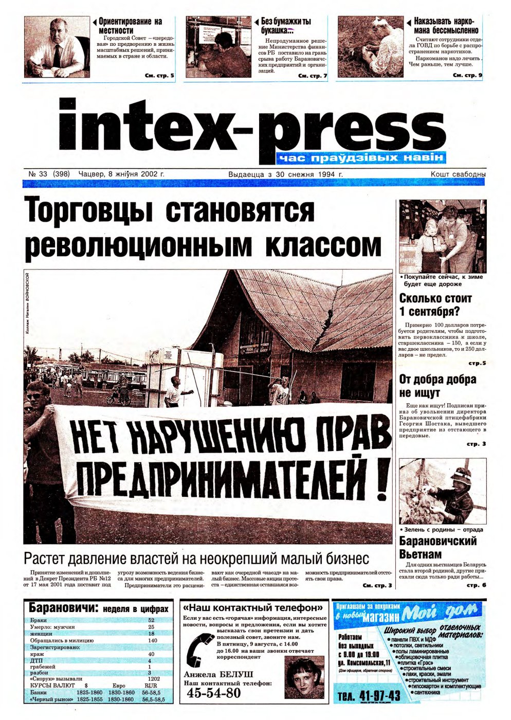 «Intex-press» — баранавіцкі недзяржаўны тыднёвік. Першы нумар выйшоў 30 сьнежня 1994 году накладам 4000 асобнікаў. Выходзіць на беларускай і расейскіх мовах. З 1996 году — галоўны рэдактар — Уладзімер Янукевіч. На падставе газэты ў 2002 створаны Выдавецкі дом «Интекс-пресс» — які выдае рэгіянальныя тыднёвікі «Ганцавіцкі час», «Ляхавіцкі час», «Нясьвіскі час». Да 2007 году ў Пінску выдавалася газэта «Мясцовы час». More »
