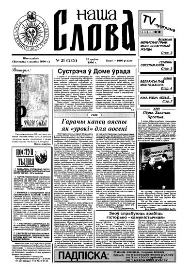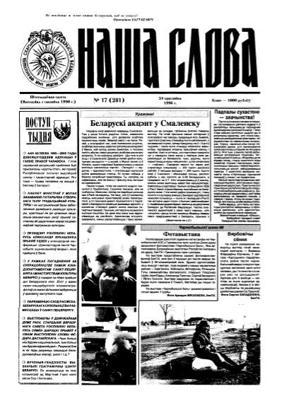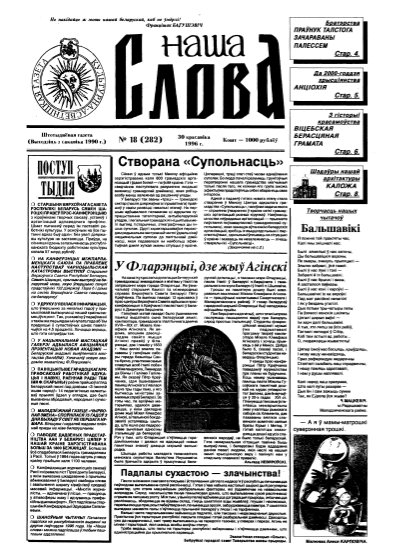 Газета “Наша слова” - газета Грамадскага аб’яднання “ТБМ імя Ф. Скарыны”, якое знаходзіцца на пярэднім краі барацьбы за нацыянальнае адраджэнне беларускага этнасу. Газета заснавана ў сакавіку 1990 года і да 1997 года выходзіла ў Менску. З лістапада 1997 года газета больш за 9 гадоў выдавалася Лідскай гарадской арганізацыя ГА “ТБМ імя Ф. Скарыны”. З 1 лютага 2007 года выдаўцом газеты “Наша слова” з’яўляецца Установа інфармацыі “Выдавецкі... More »