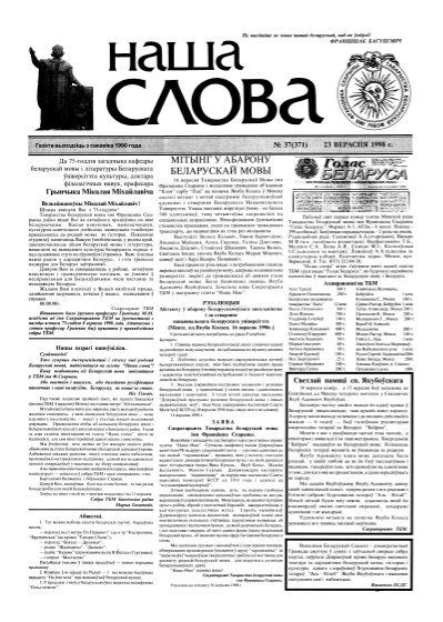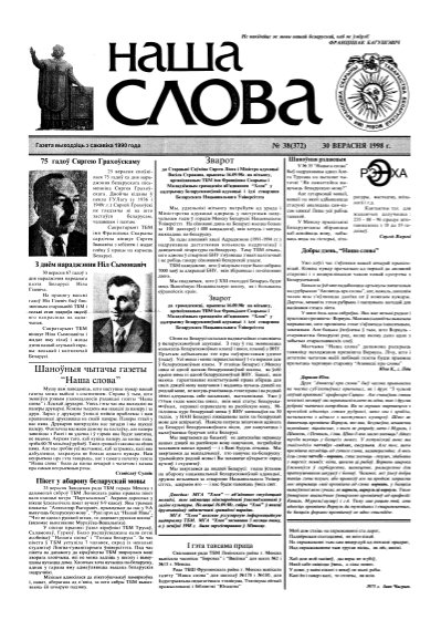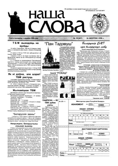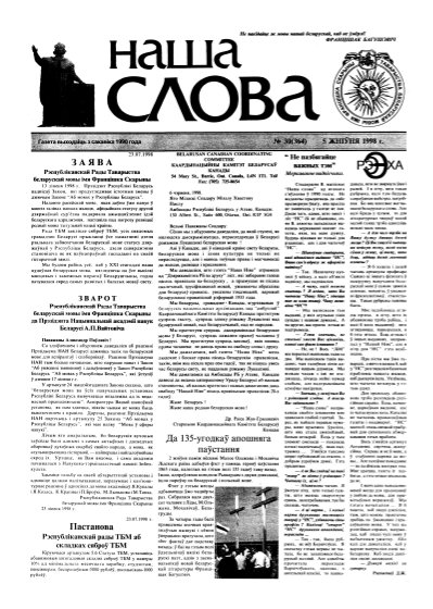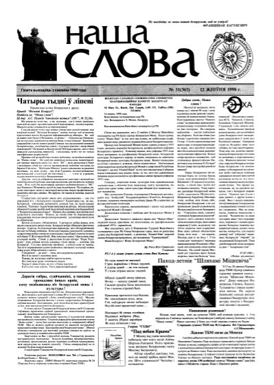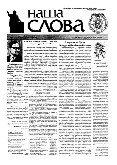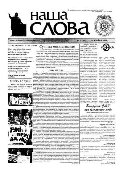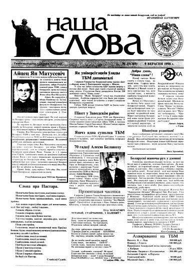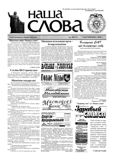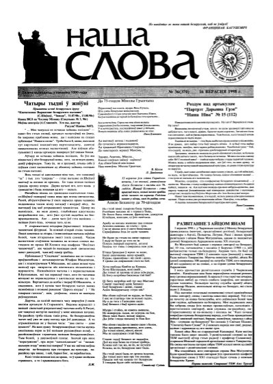 Газета “Наша слова” - газета Грамадскага аб’яднання “ТБМ імя Ф. Скарыны”, якое знаходзіцца на пярэднім краі барацьбы за нацыянальнае адраджэнне беларускага этнасу. Газета заснавана ў сакавіку 1990 года і да 1997 года выходзіла ў Менску. З лістапада 1997 года газета больш за 9 гадоў выдавалася Лідскай гарадской арганізацыя ГА “ТБМ імя Ф. Скарыны”. З 1 лютага 2007 года выдаўцом газеты “Наша слова” з’яўляецца Установа інфармацыі “Выдавецкі... More »