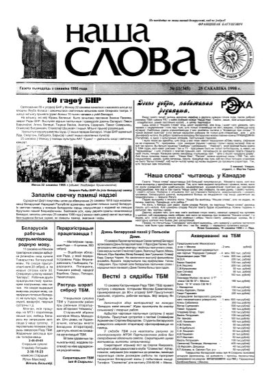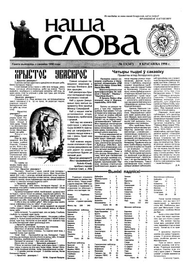 Газета “Наша слова” - газета Грамадскага аб’яднання “ТБМ імя Ф. Скарыны”, якое знаходзіцца на пярэднім краі барацьбы за нацыянальнае адраджэнне беларускага этнасу. Газета заснавана ў сакавіку 1990 года і да 1997 года выходзіла ў Менску. З лістапада 1997 года газета больш за 9 гадоў выдавалася Лідскай гарадской арганізацыя ГА “ТБМ імя Ф. Скарыны”. З 1 лютага 2007 года выдаўцом газеты “Наша слова” з’яўляецца Установа інфармацыі “Выдавецкі... More »