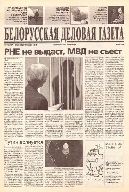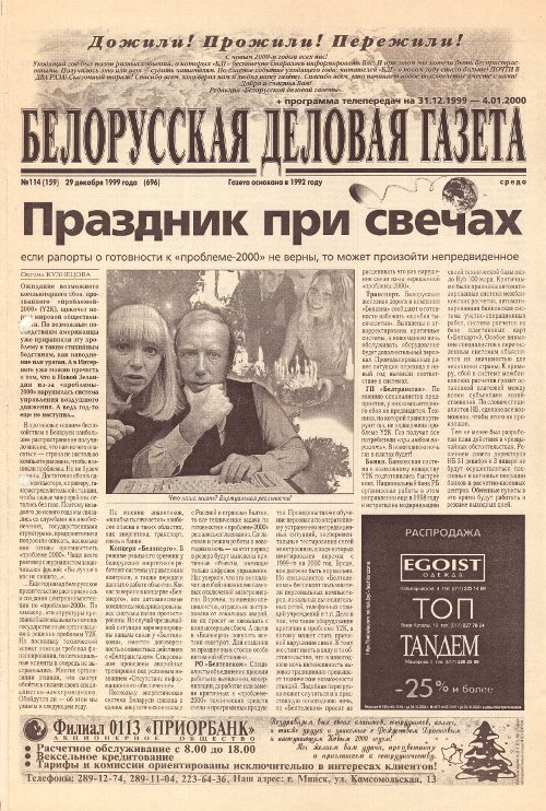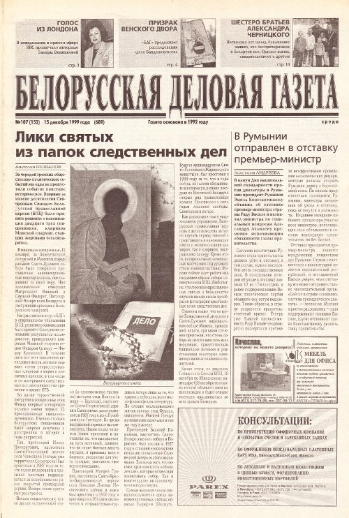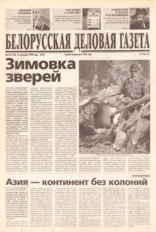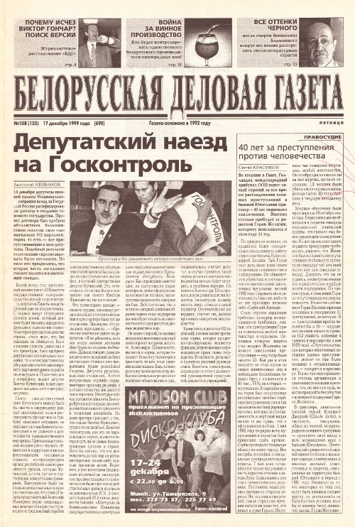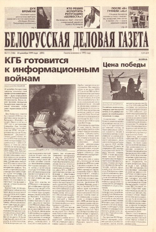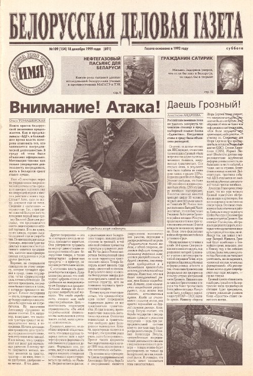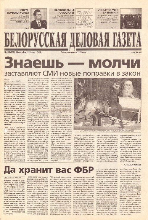 «Белорусская деловая газета» (па-беларуску: «Беларуская дзелавая газэта») — беларуская грамадзка-палітычная газэта, заснаваная ў 1992 годзе. Заснавальнікам і выдаўцом «БДГ» зьяўляецца Выдавецкае прыватнае вунітарнае прадпрыемства «Марат». «БДГ» — штодзённае незалежнае выданьне дзелавых і палітычных кругоў Беларусі. «БДГ» зьяўляецца адным з найболей аўтарытэтных незалежных СМІ Беларусі. За час дзейнасьці газэты ўладамі неаднаразова прадп... Болей »