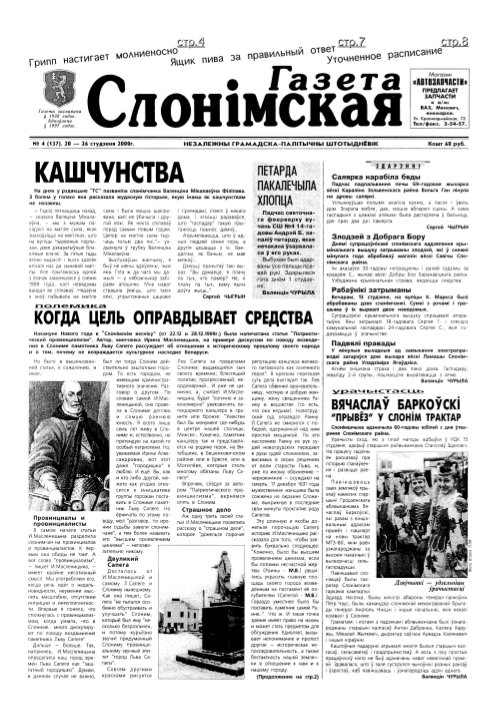 «Газета Слонімская» (скарочана «ГС», польск. Gazeta Słonimska) — беларуская штотыднёвая грамадска-палітычная газета, якая выходзіць у Слоніме. Упершыню выйшла ў 1938 годзе на польскай мове (ўсяго выйшла 4 нумары). «Газета Слонімская» была адноўленая ў 1997 годзе як незалежнае грамадска-палітычнае выданне на рускай і беларускай мовах. Яе заснавальнікам і галоўным рэдактарам стаў Віктар Валадашчук. Першы нумар адроджанай «Газеты Слонімска... Болей »