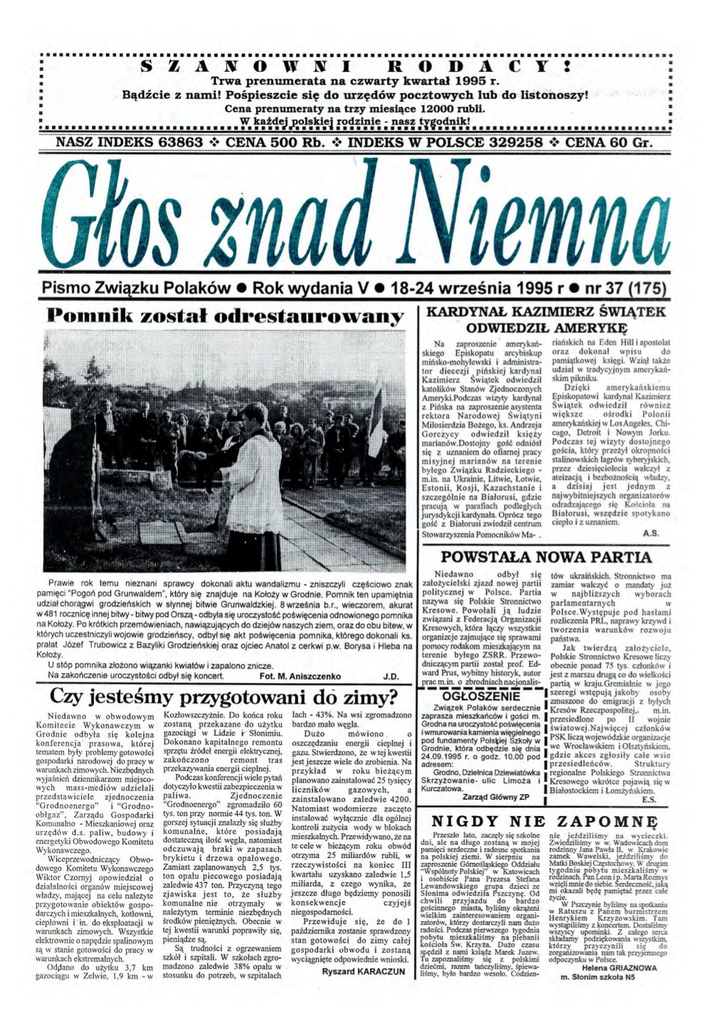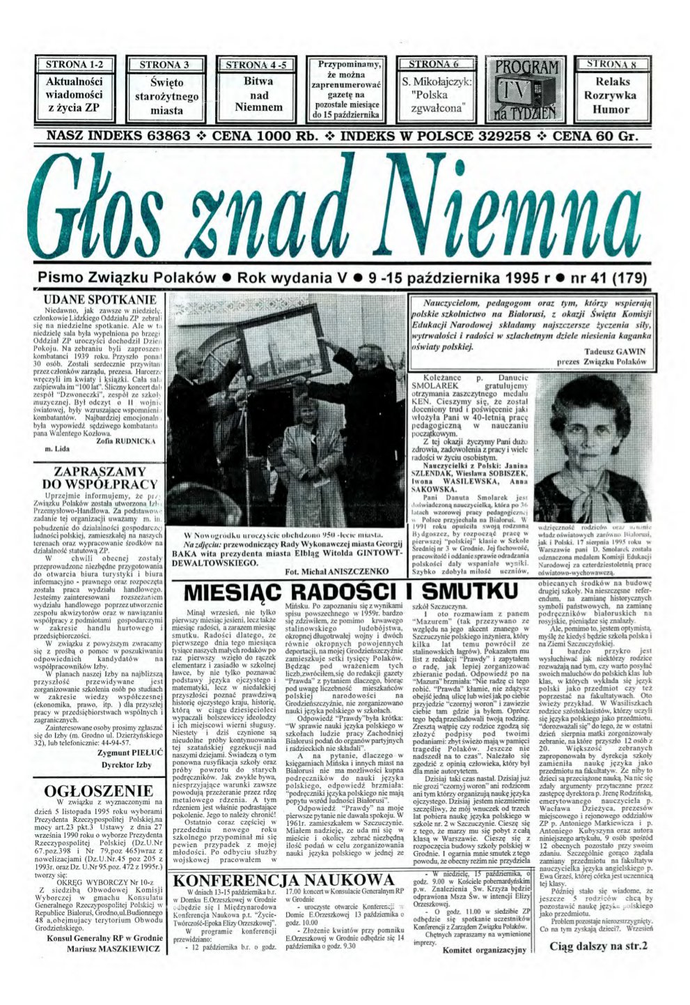 «Głos znad Niemna» — polskojęzyczny tygodnik wydawany na Białorusi od 3 grudnia 1989 roku; organ prasowy Związku Polaków na Białorusi. Twórcą i pierwszym redaktorem pisma był Eugeniusz Skrobocki z Grodna. Dzięki jego zaangażowaniu pierwsze numery „Głosu znad Niemna” otrzymał Papież Jan Paweł II podczas prywatnej audiencji władz Związku w Watykanie w roku 1990. Pierwszy numer ukazał się jako dodatek specjalny do Czerwonego Sztandaru z ok... Болей »