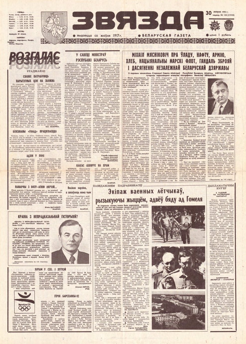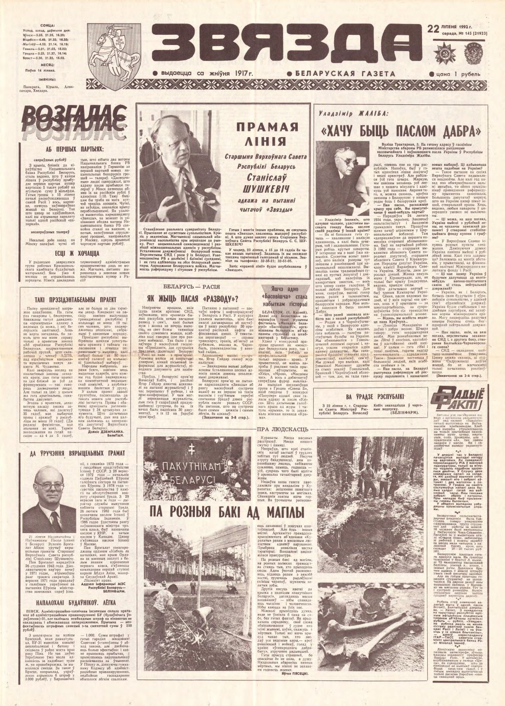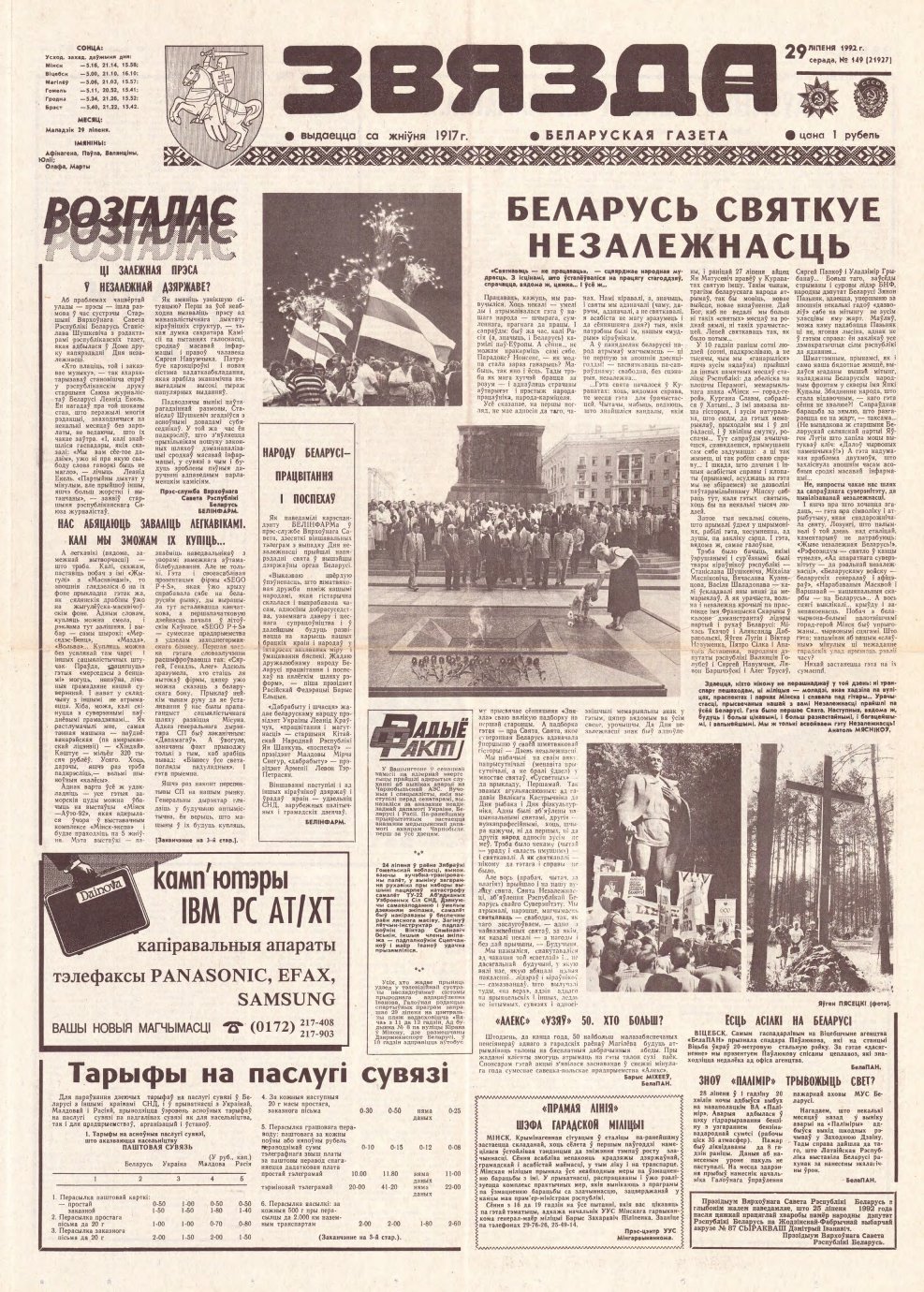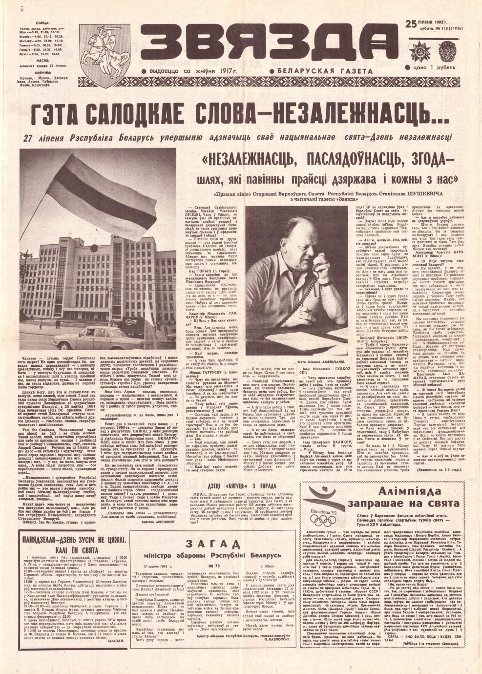 «Звязда» — орган Цэнтральнага Камітэта Камуністычнай партыі Беларусі, Вярхоўнага Савета і Савета Міністраў Беларускай ССР. Выходзіць 250 разоў на год. Аўтары апублікаваных матэрыялаў нясуць адказнасць за падбор і дакладнасць фактаў. Іх меркаванні неабавязкова адлюстроўваюць пункт гледжання рэдакцыі. Болей »