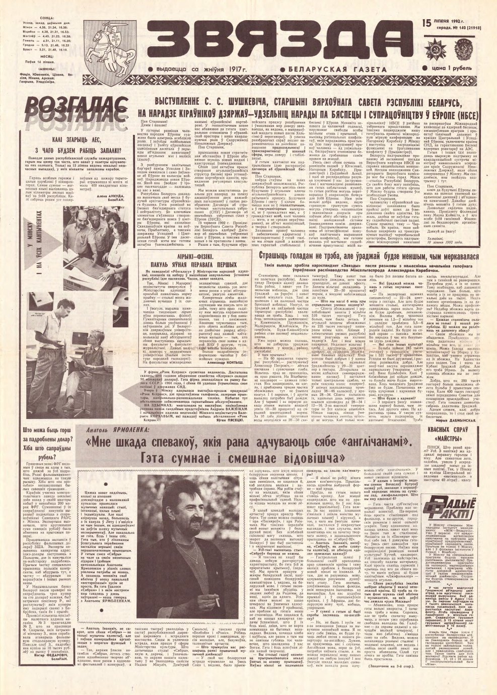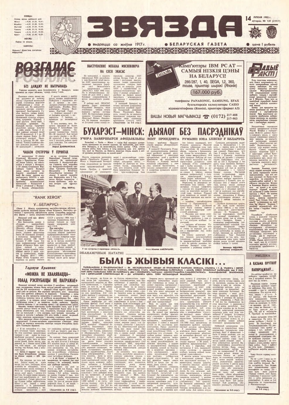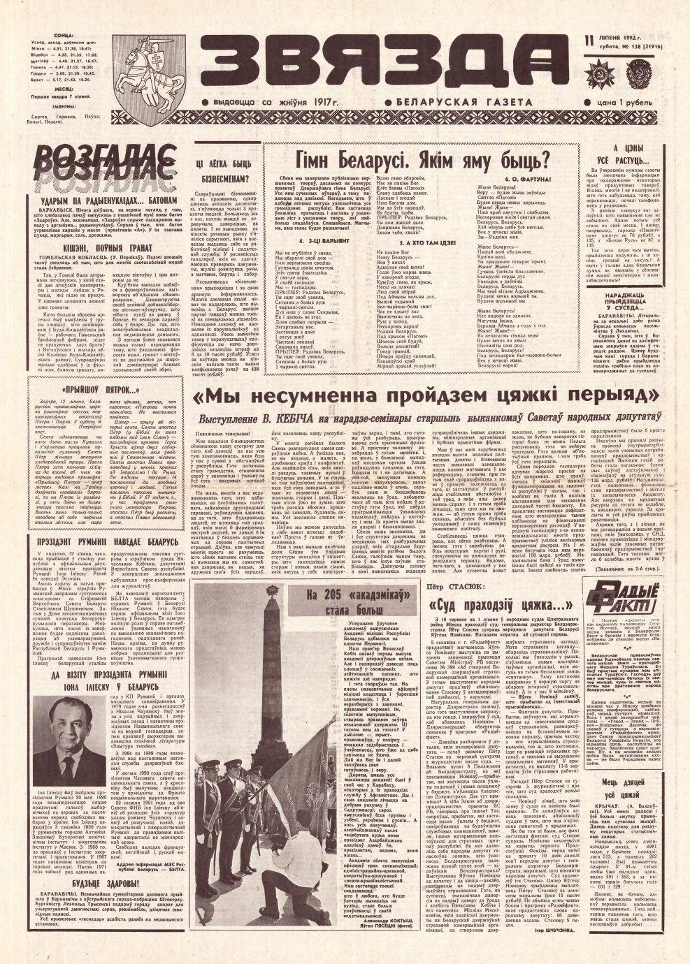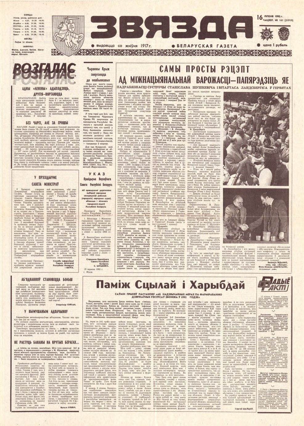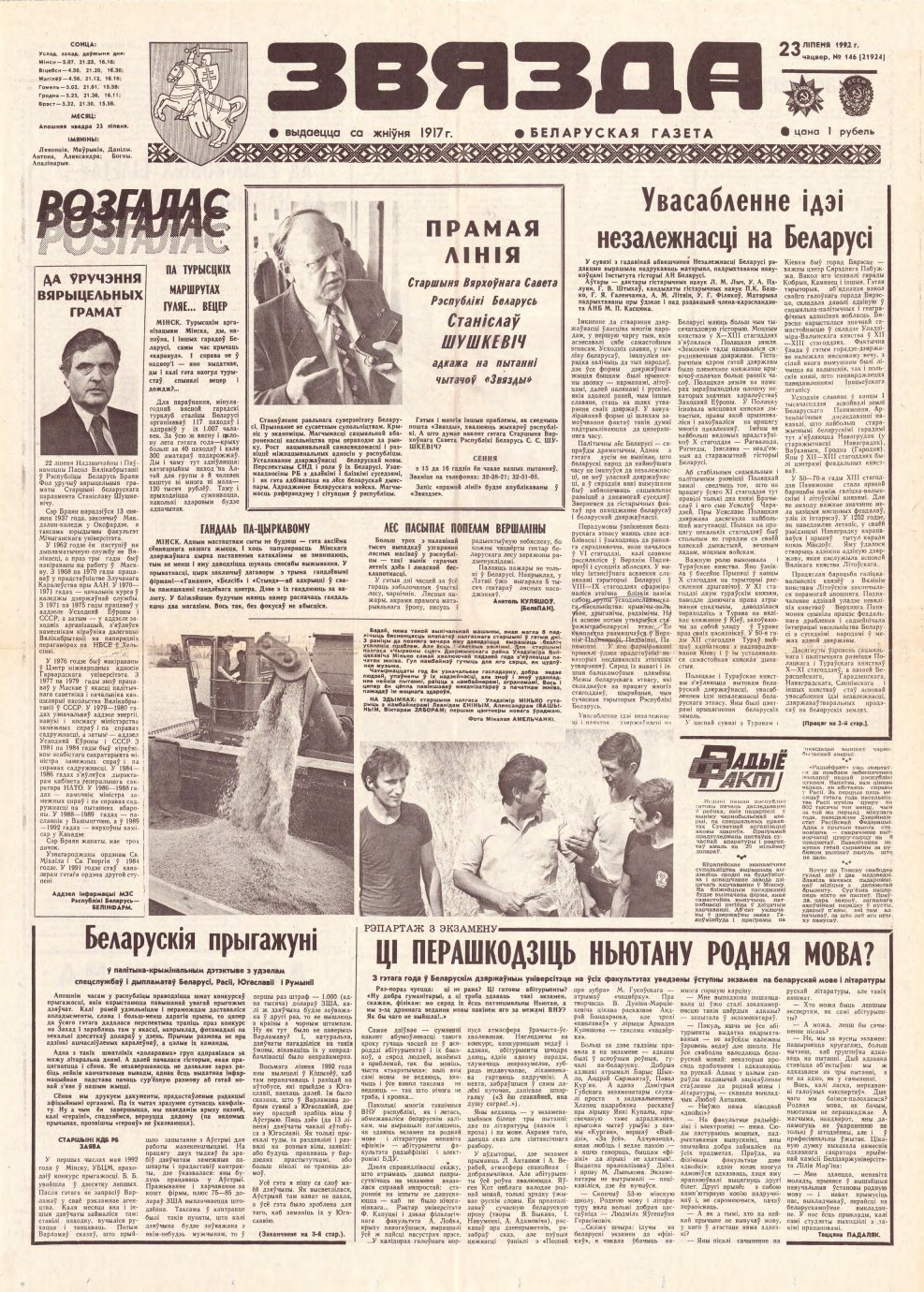 «Звязда» — орган Цэнтральнага Камітэта Камуністычнай партыі Беларусі, Вярхоўнага Савета і Савета Міністраў Беларускай ССР. Выходзіць 250 разоў на год. Аўтары апублікаваных матэрыялаў нясуць адказнасць за падбор і дакладнасць фактаў. Іх меркаванні неабавязкова адлюстроўваюць пункт гледжання рэдакцыі. Болей »